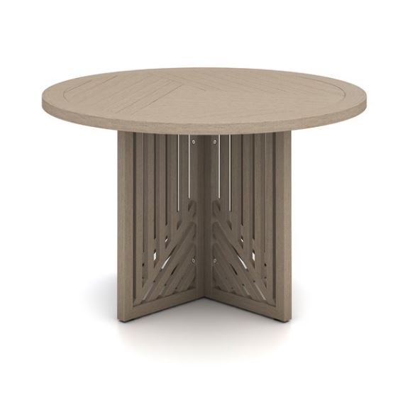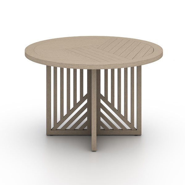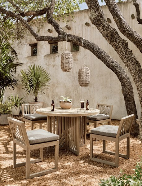 Finished in a versatile washed brown, an outdoor-friendly dining table of solid FSC-certified teak features an abstract slat pattern for eye-catching effect. Seats four comfortably. Cover or store indoors during inclement weather and when not in use.