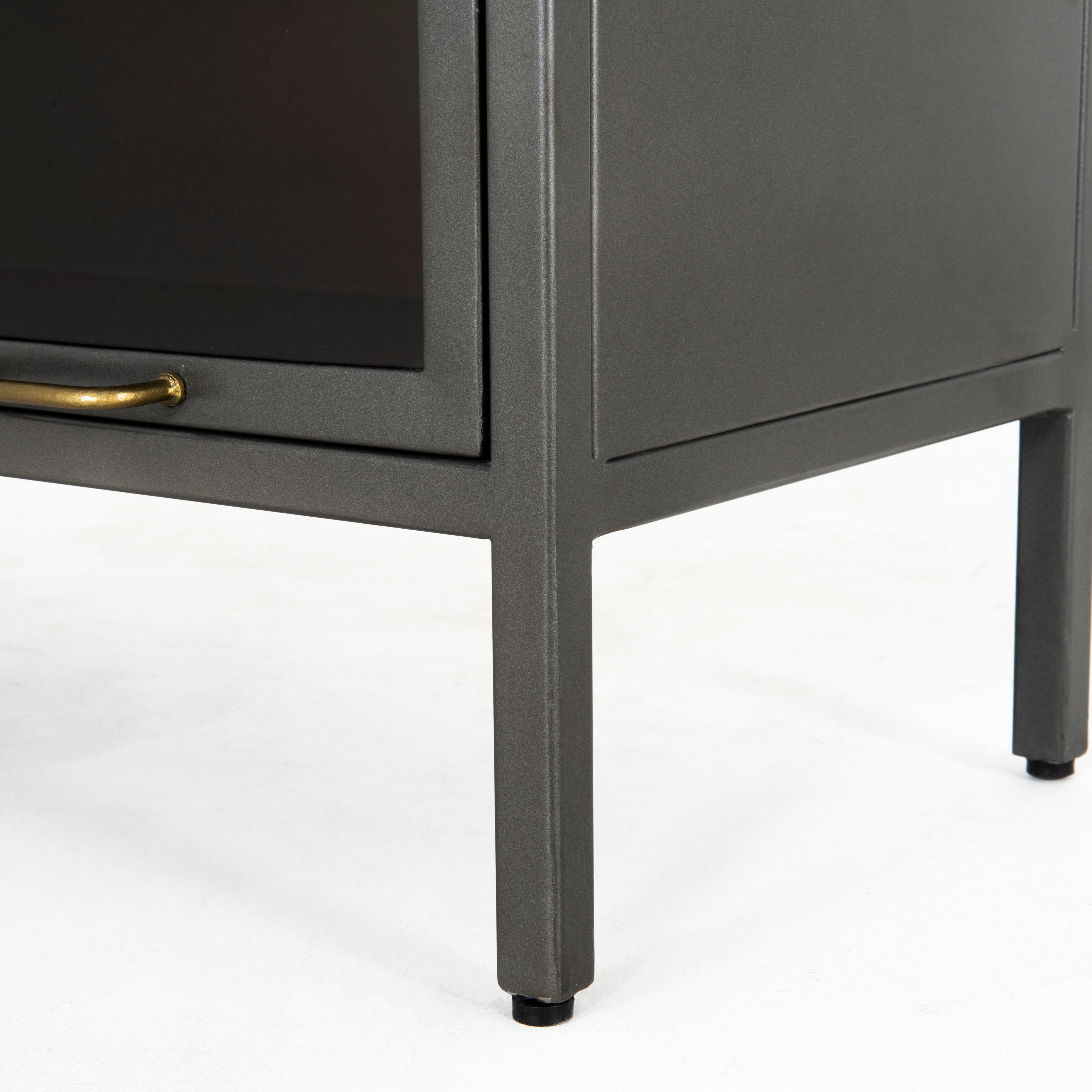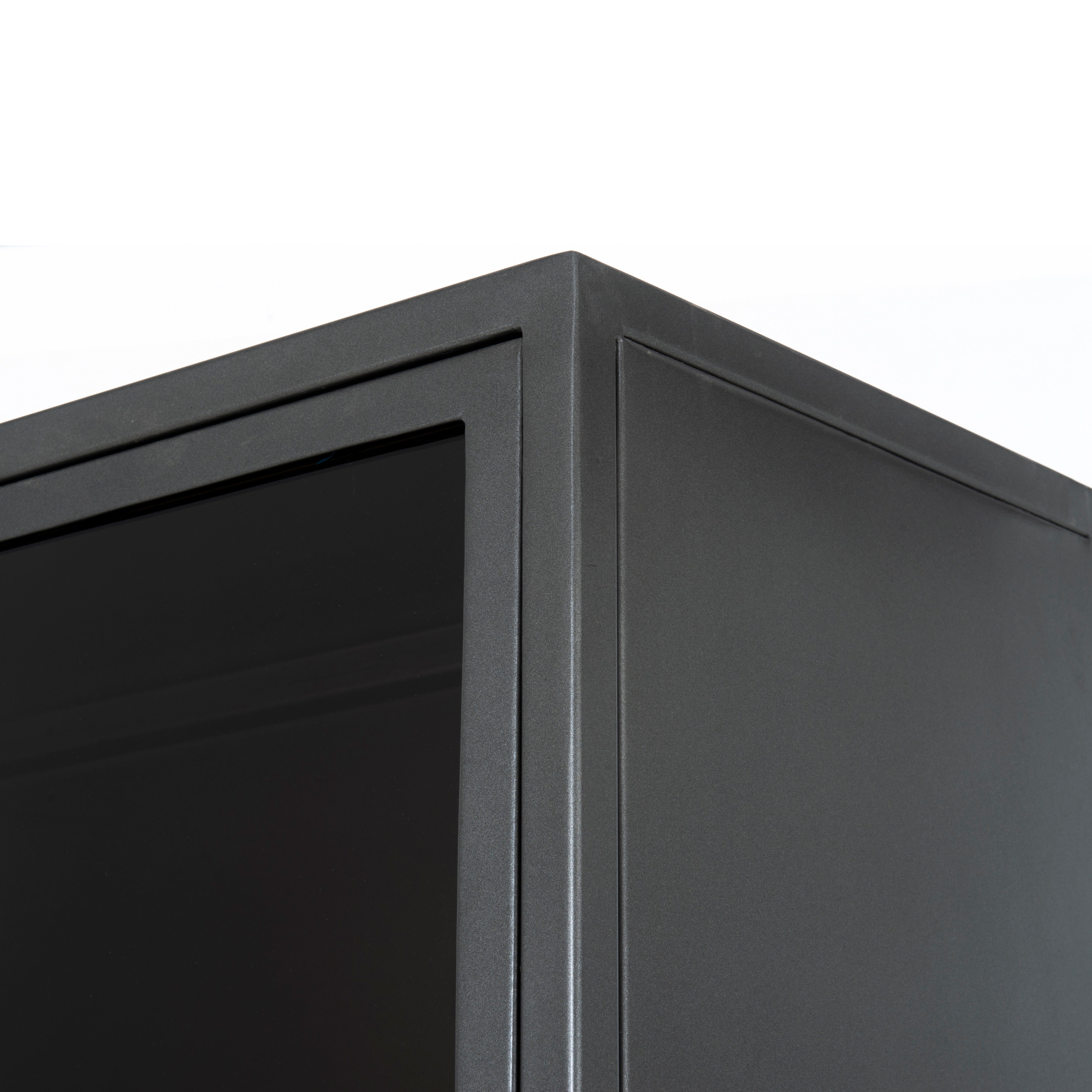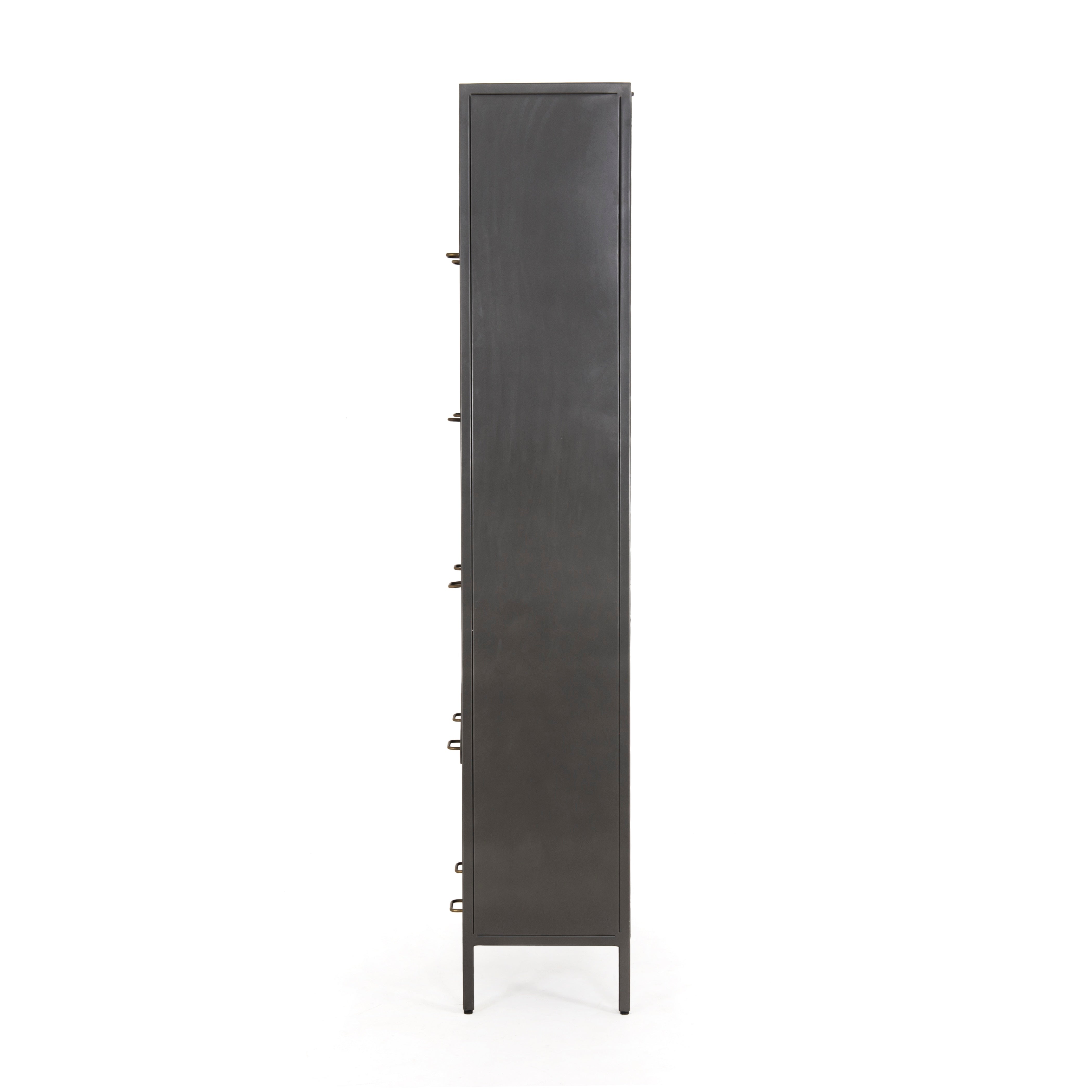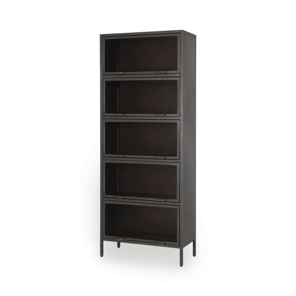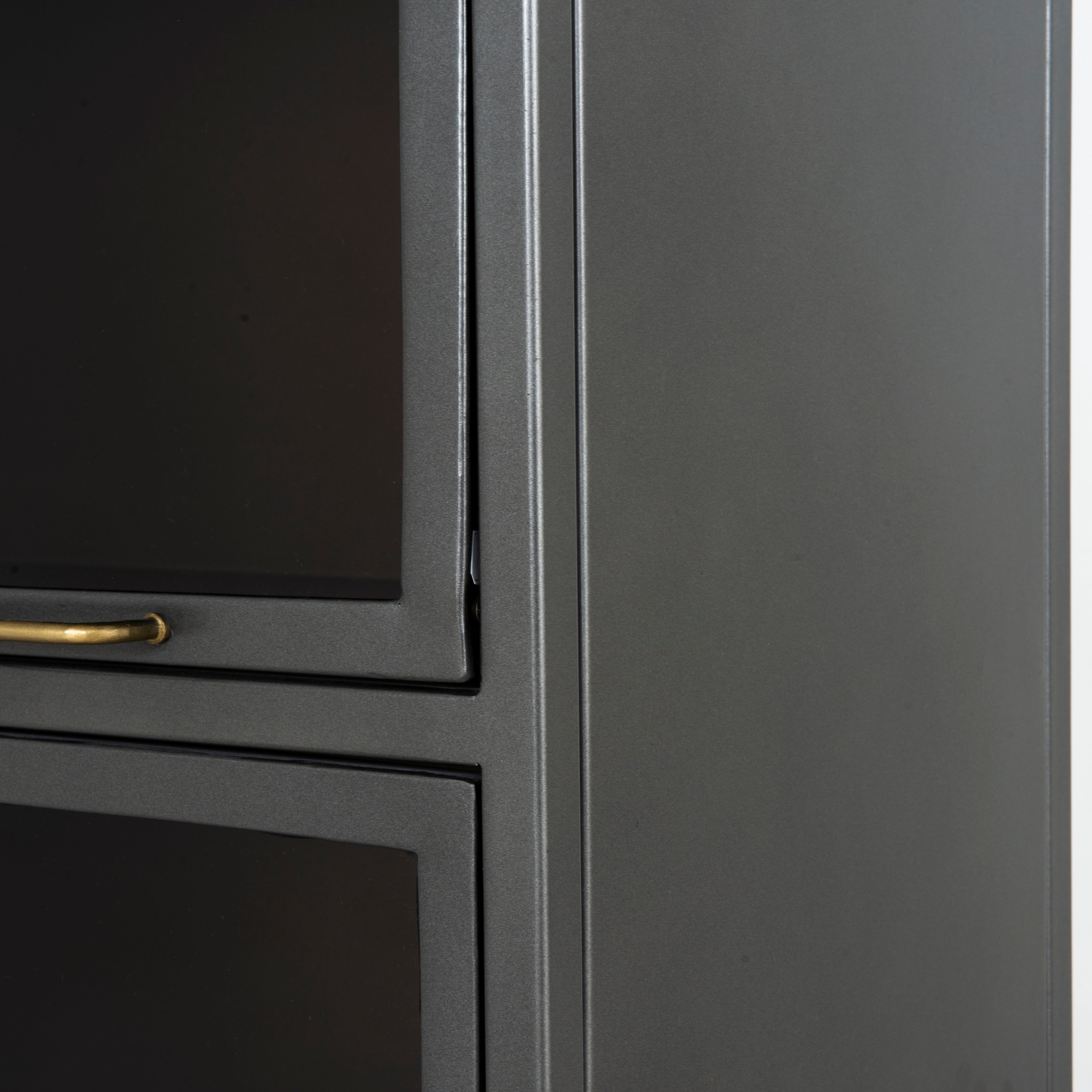 Inspired by the stackable barrister-style shelving, iron casing is finished in a gunmetal for a fresh industrial look, with smoked glass panes with flat brass hardware cover door fronts, each lifting to spacious compartments for storage of books and treasures.