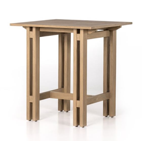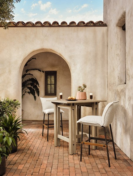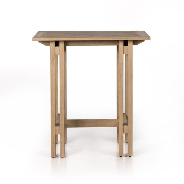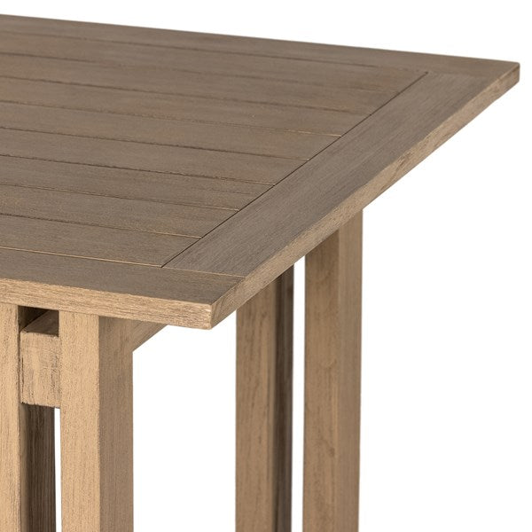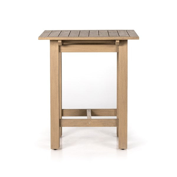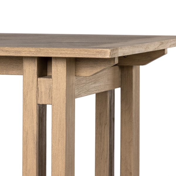 Made from solid FSC-certified teak finished in a versatile washed brown, an architectural I-beam bar table brings a primitive, craftsman-like look to outdoor entertaining. Cover or store indoors during inclement weather and when not in use.