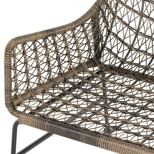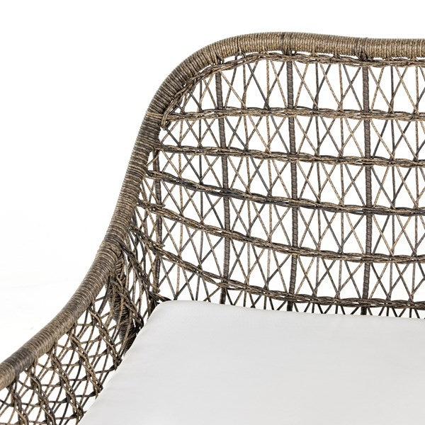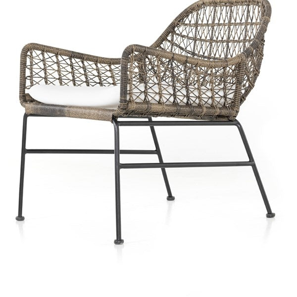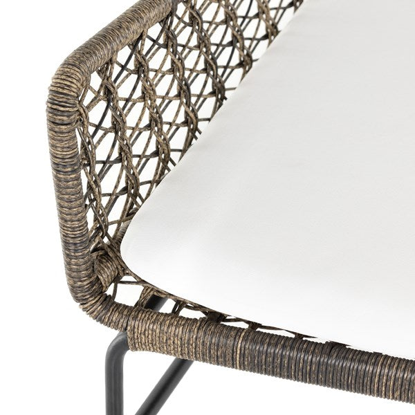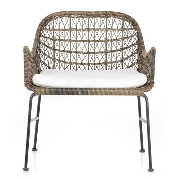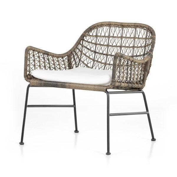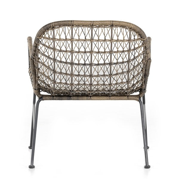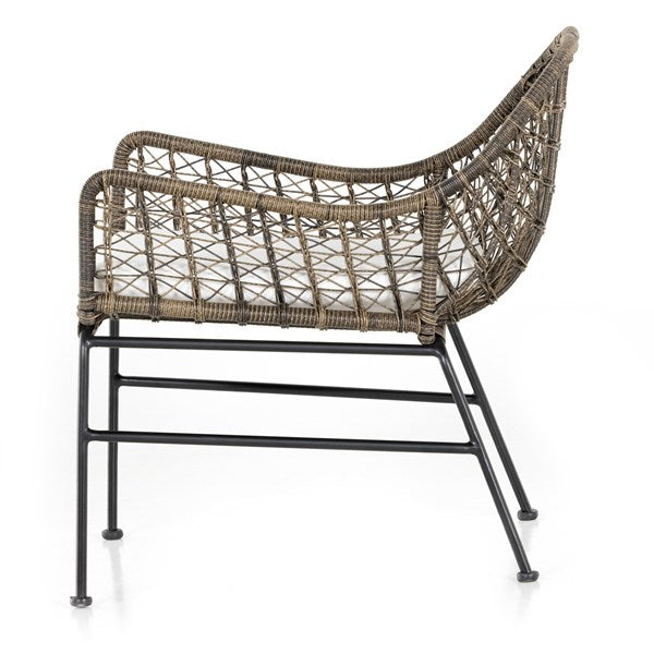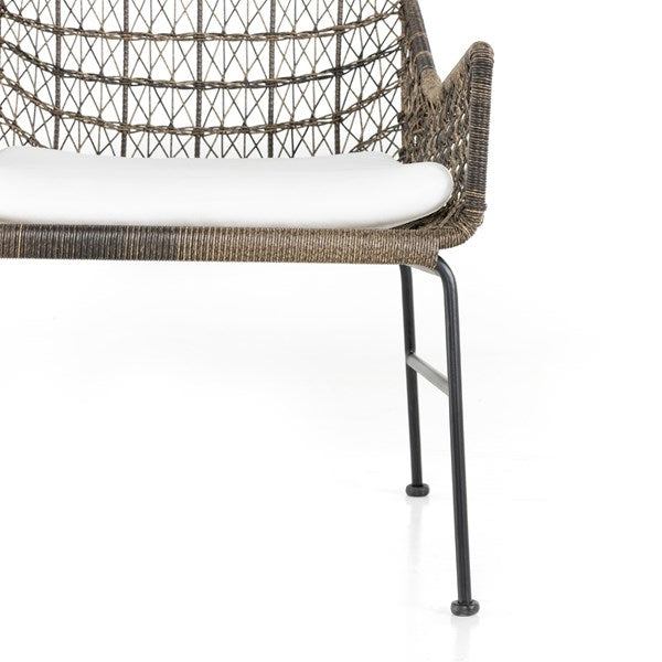 Clean, contemporary shaping and an updated weave transform all-weather wicker into something modern. This take on the classic club chair is supported by an airy black-finished iron base, with a white seat cushion for added comfort. Safe for outdoor spaces- cover or store indoors during inclement weather and when not in use.