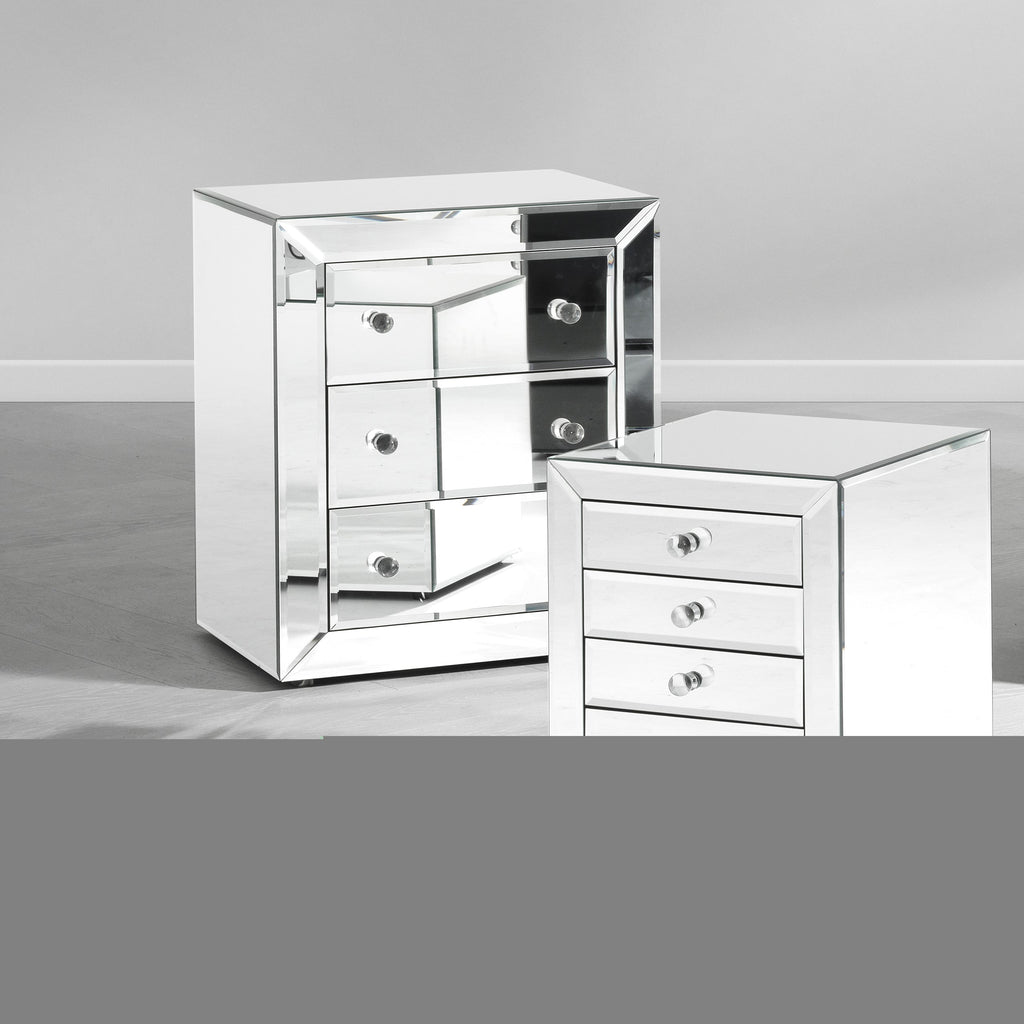 Made from beveled clear mirror glass, the Reagan Bedside Table features a rectangular frame with straight line detail and four storage drawers.