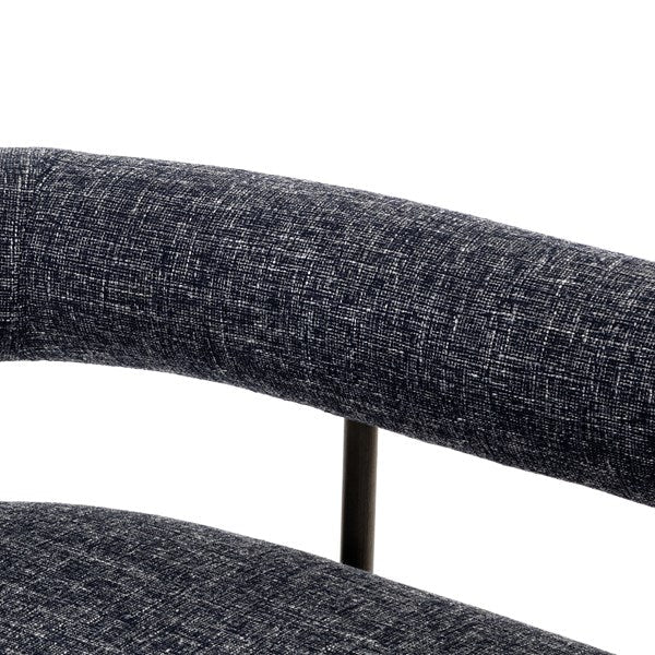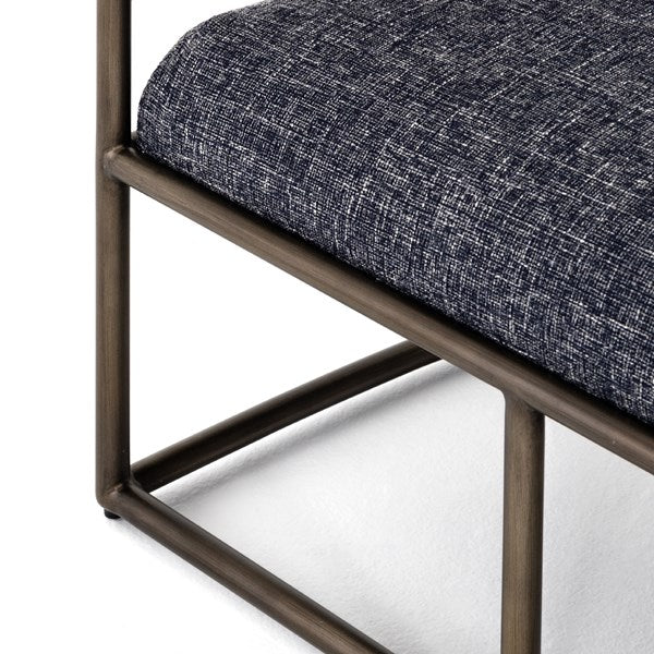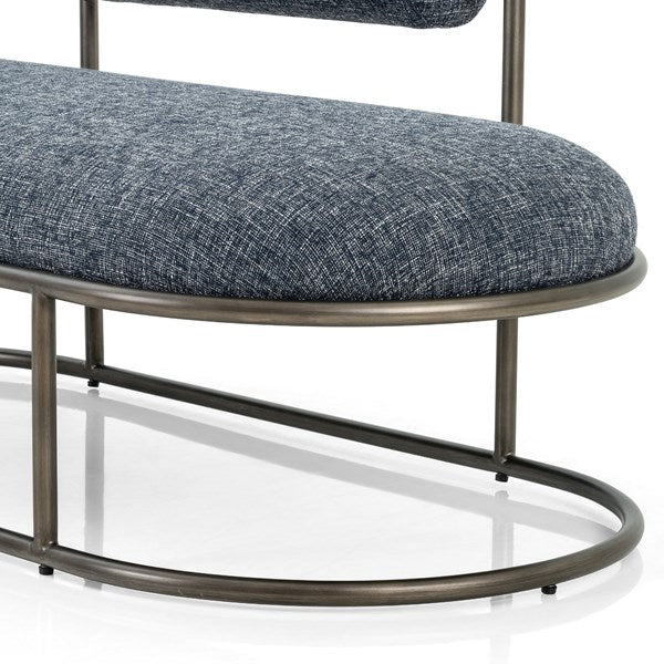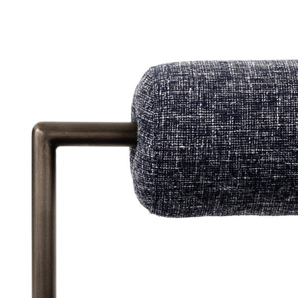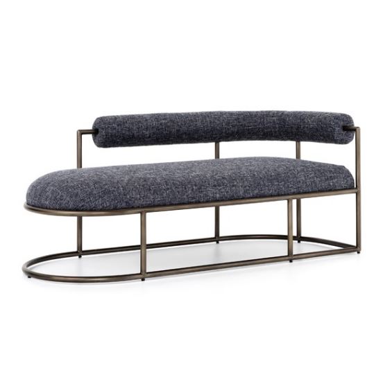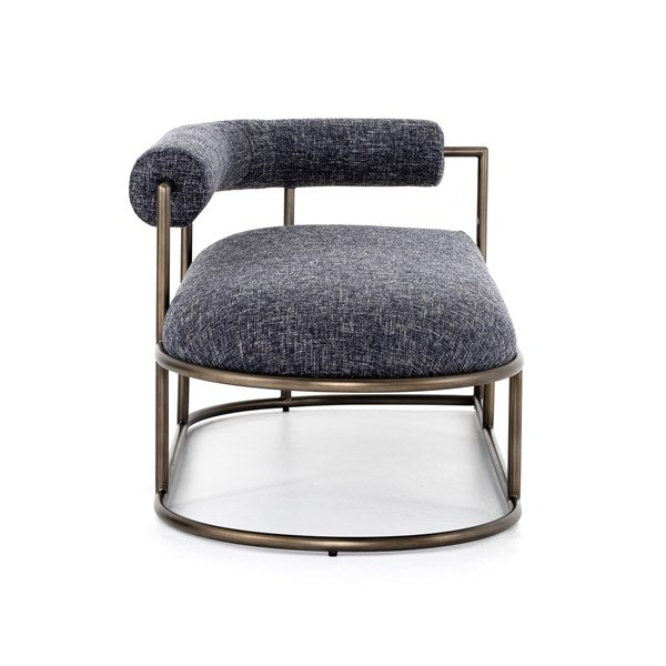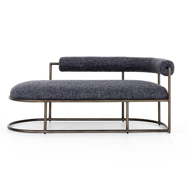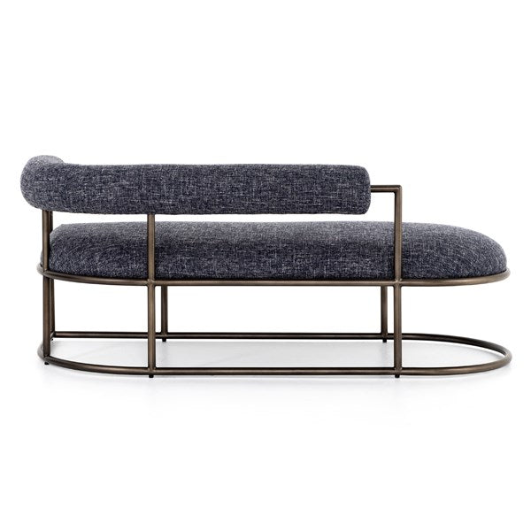 Sultry sophistication refreshes the retro fainting chair, as slate-brushed iron curves to frame soft Four Hands-exclusive high-performance upholstery in a textural navy. Right-arm facing chaise.