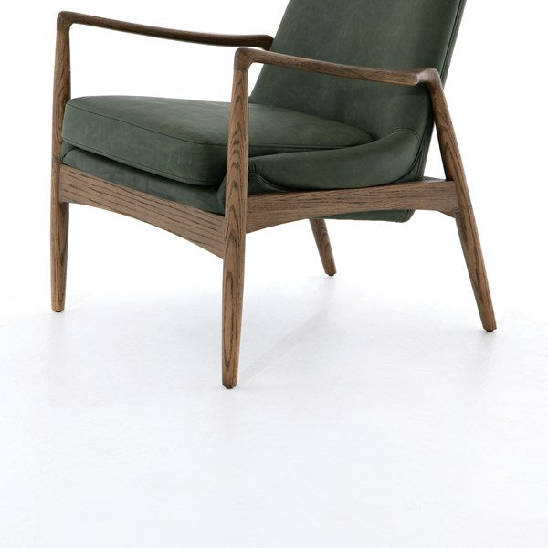 Dramatic arms and a deeper seat offer relaxation with mid-century modern sophistication. Sculpted oak framing adds an architectural feel to rich top-grain leather in a mossy sage.