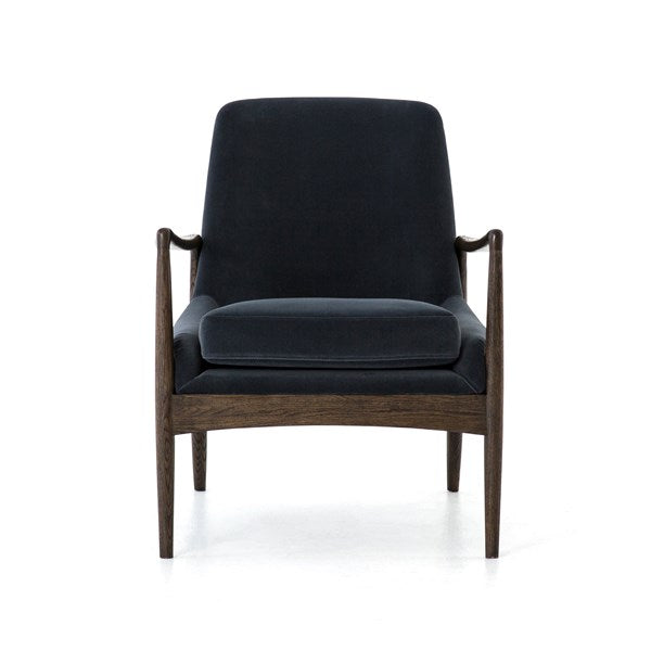 Dramatic arms and deep seat offer relaxation with mid-century modern sophistication. Sculpted cedar frame adds an architectural feel to neutral-toned velvet upholstery.