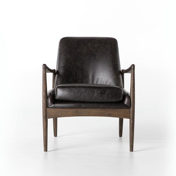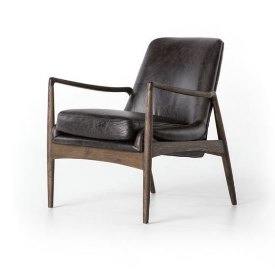 Dramatic arms and a deeper seat offer relaxation with mid-century modern sophistication. Sculpted frame adds an architectural feel to rich, black top-grain leather.
