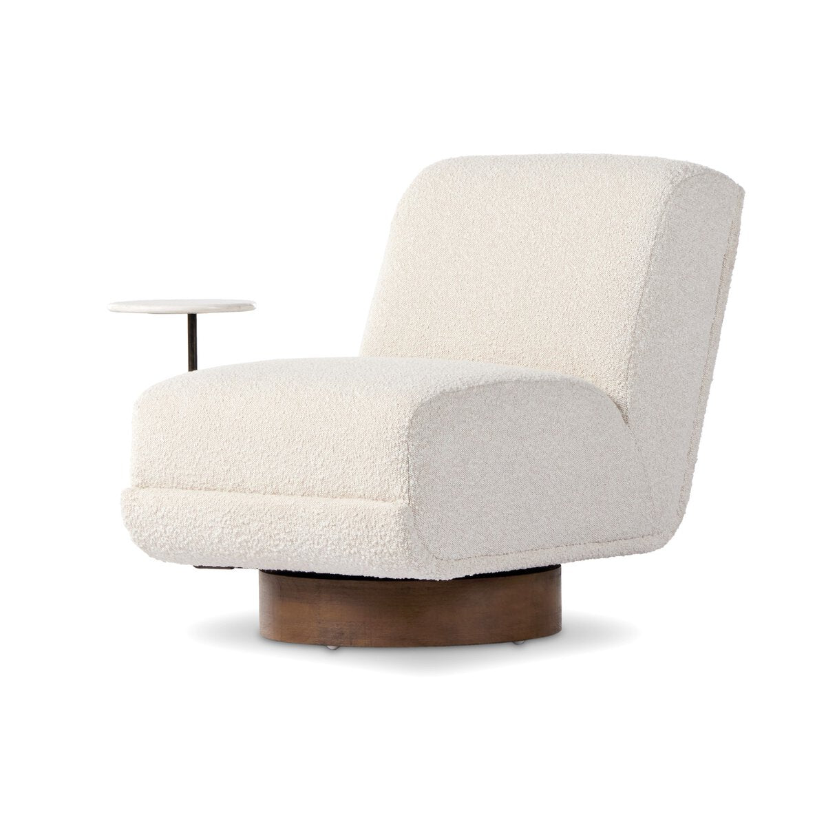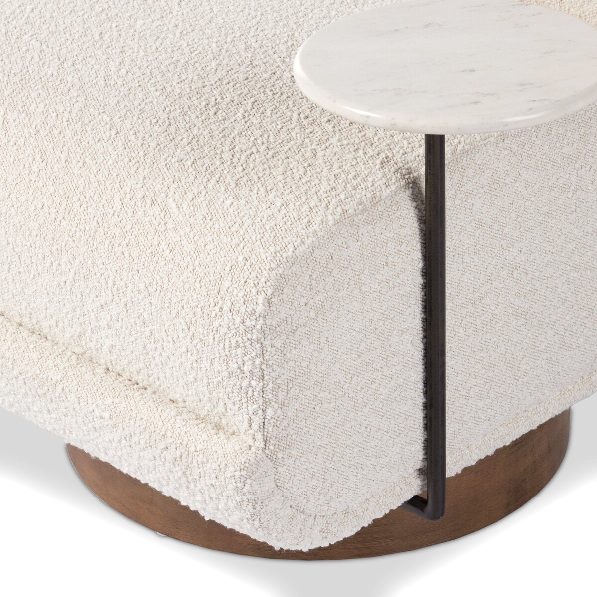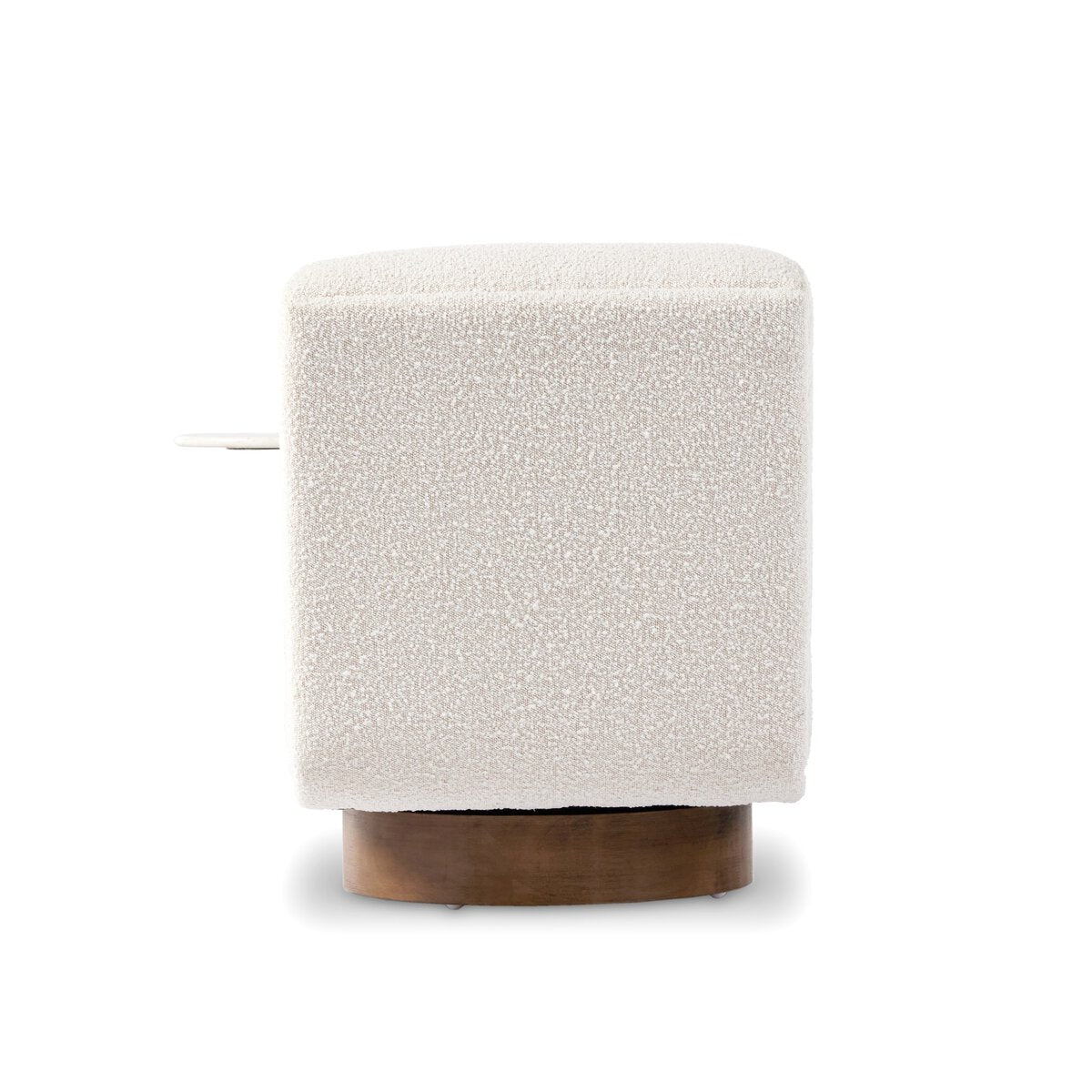 A stylish play on function. With chunky, cream-colored upholstery, armless accent seating tops a rounded parawood swivel base, wire-brushed for subtle vintage vibes. Option to pair with matching side table, which can be fastened to or removed from either side with ease.