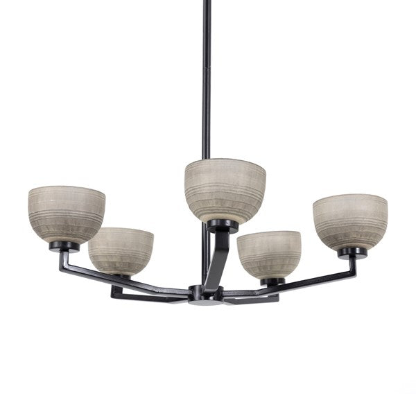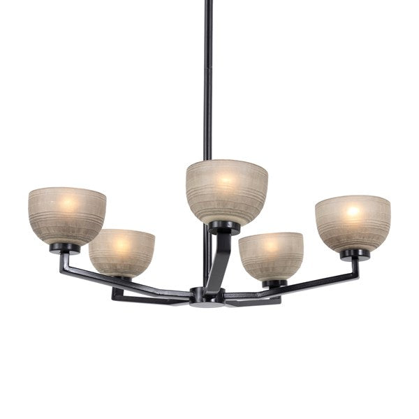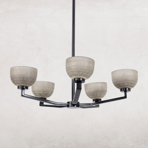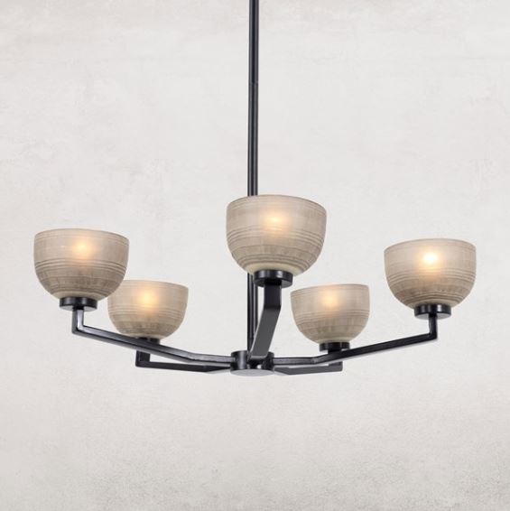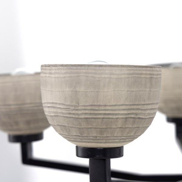 Hand-finished chandelier with an emphasis on elegance. Etching and layered, a liquid silver finish ushers a uniquely artful look to glass shads, with antique iron arms.
