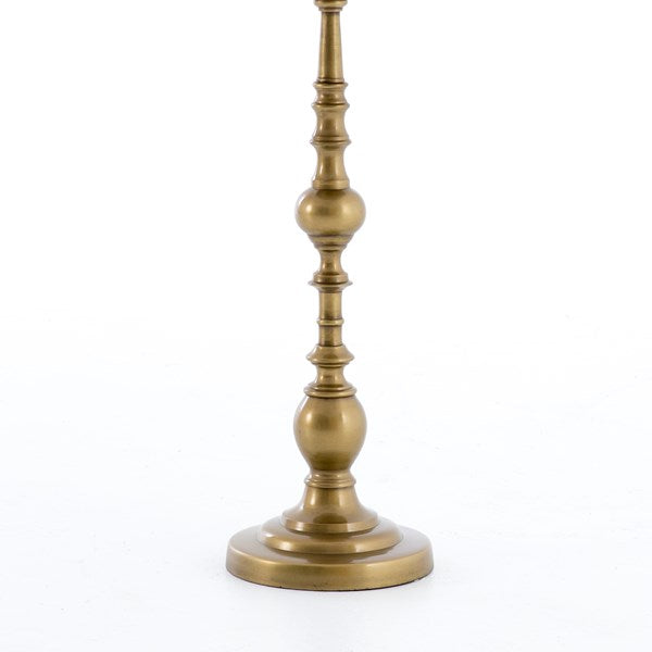 Vintage-spun sophistication adopts a fresh feel. A candlestick-style pedestal table is finished in an antique brass, offering a handy extra surface where needed. Perfect solo or in pairs.