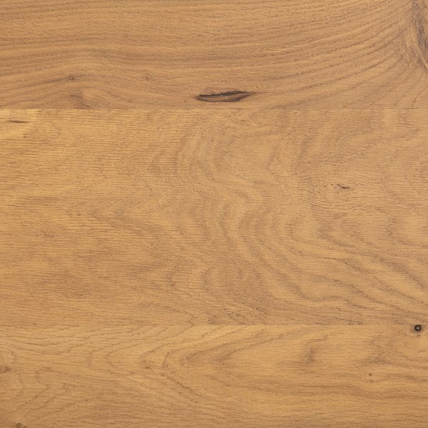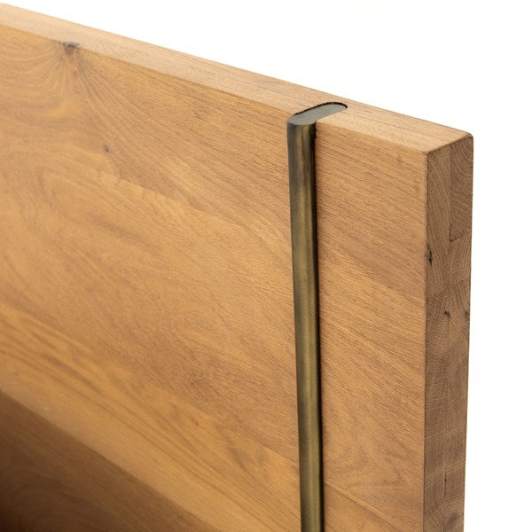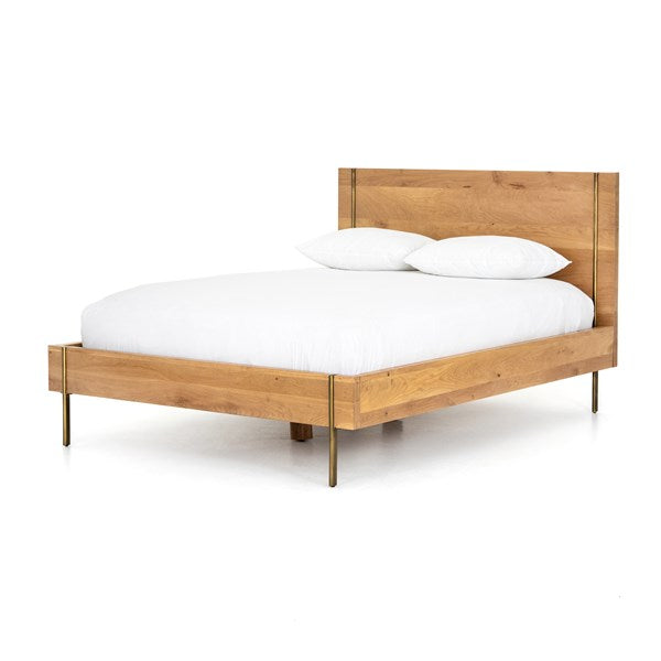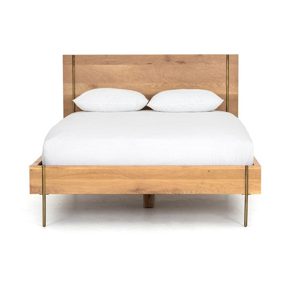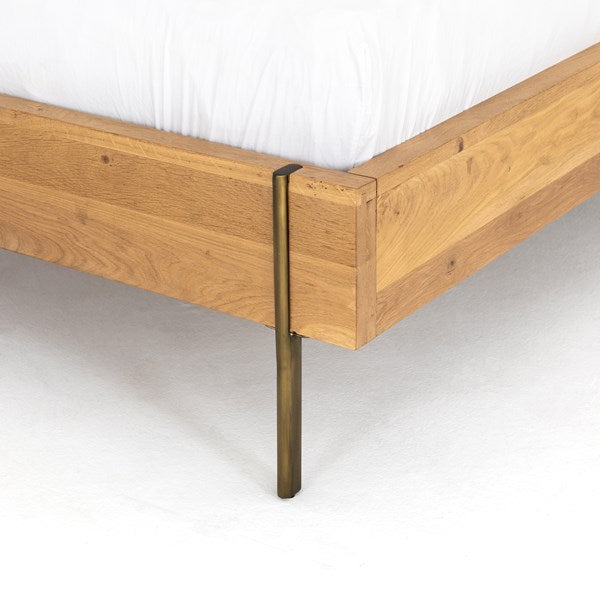 Style meets simplicity in this Danish-inspired design. Solid natural oak forms clean lines, adopting linear insets of satin brass on head and footboard for added intrigue. Box spring not required.
