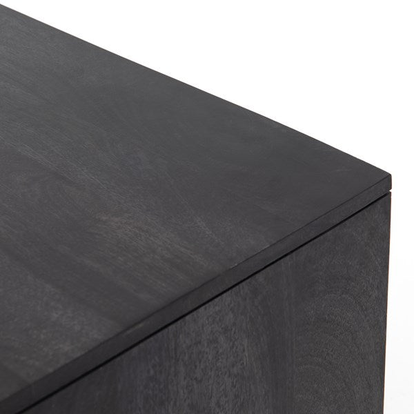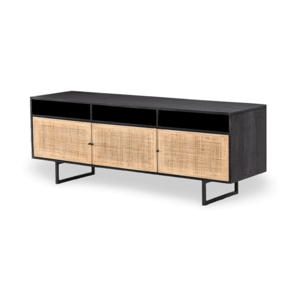 Mid-century-inspired style with an organic twist. Surrounded by black mango casing, light cane weaves for a fresh look with natural depth. Angular gunmetal-finished iron legs offer an intriguing contrast of texture and tone. Shelving and posterior cord management for modern media storage.