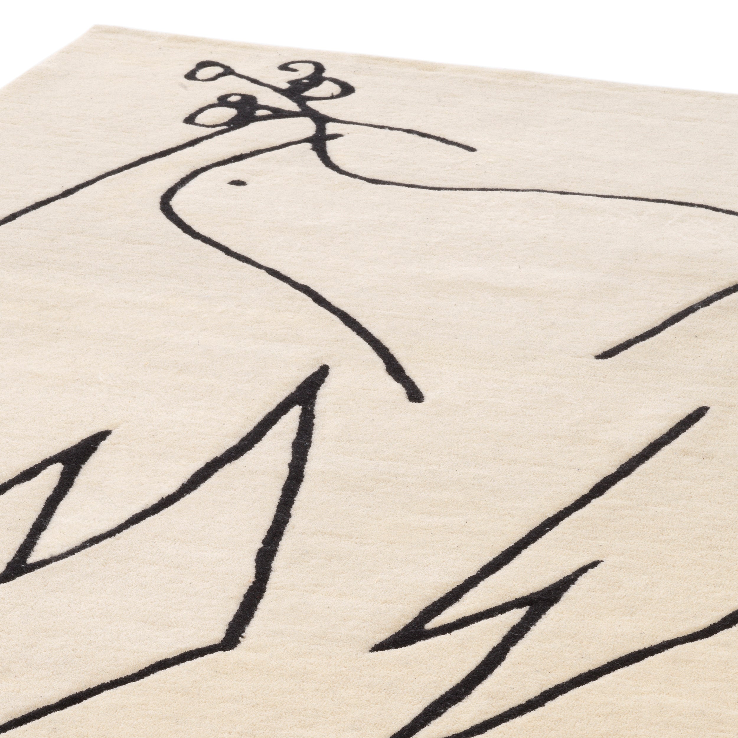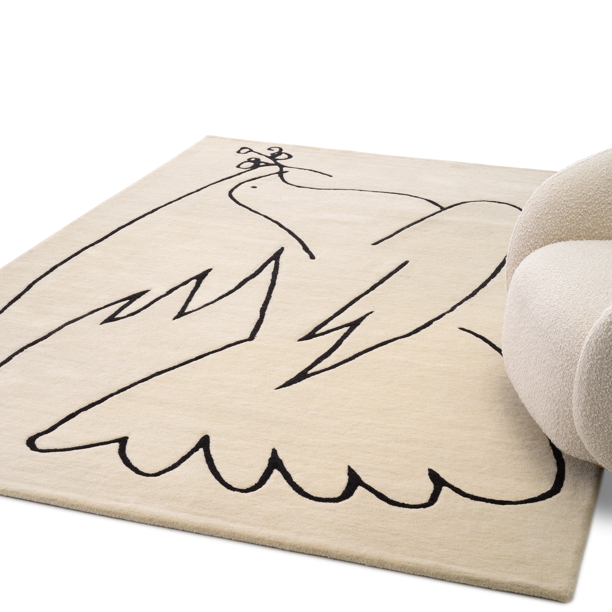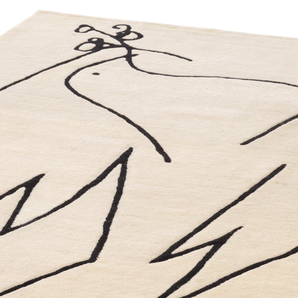 Hand tufted from New Zealand wool pile, the off-white and black Piccione Carpet features a white pigeon with an olive twig in its beak, also known as the dove of peace, one of the world"s most recognizable symbols of harmony.