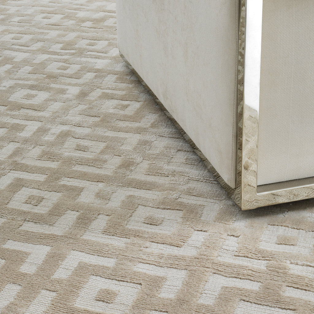 With its natural look and beautiful graphic pattern, the Reeves Carpet will enhance your decor. It is handwoven of 100% viscose, a natural synthetic fiber.