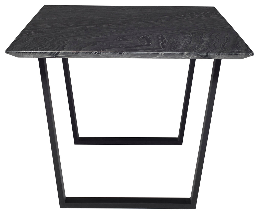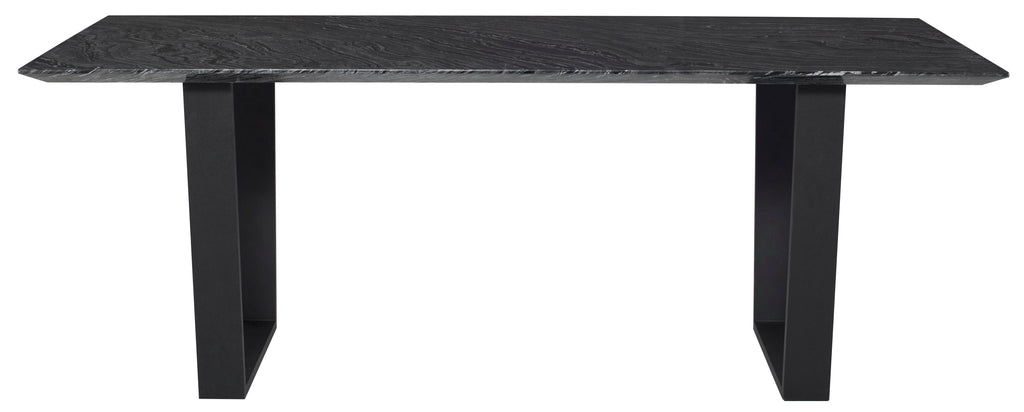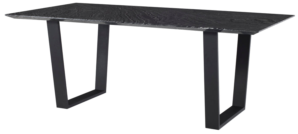The Catrine dining table is a striking example of elegant contemporary design. Bold modern lines define the Catrine, pairing a cool textured marble table top with sculpturally minimalist matte black flattened steel black water nein legs presenting a sophisticated urban aesthetic.