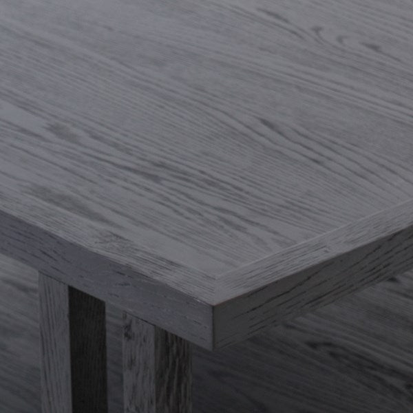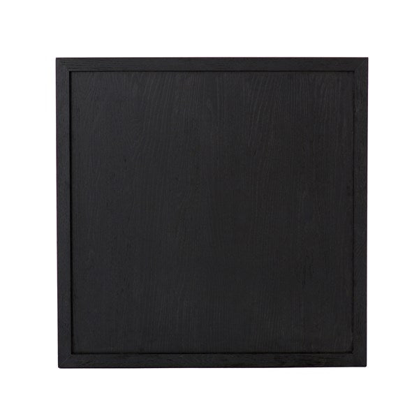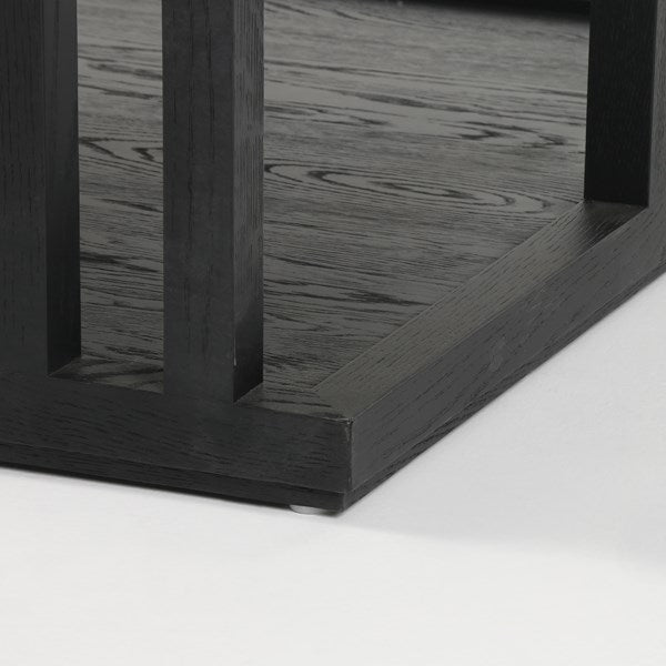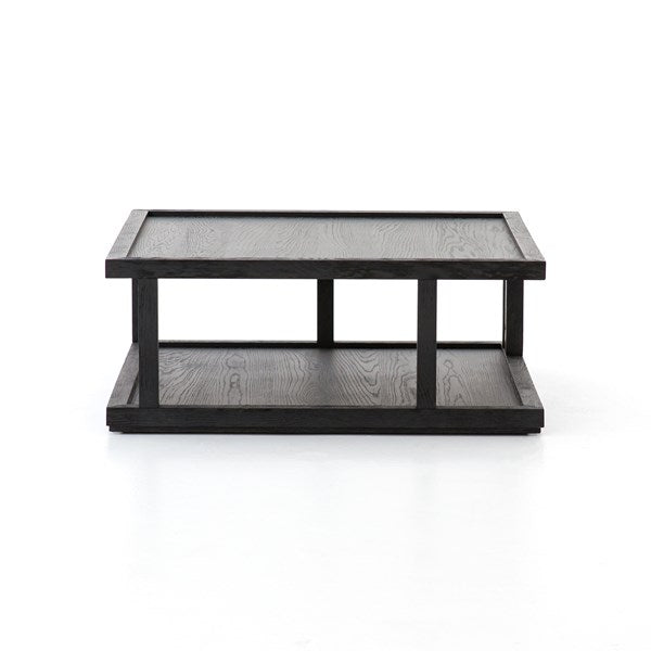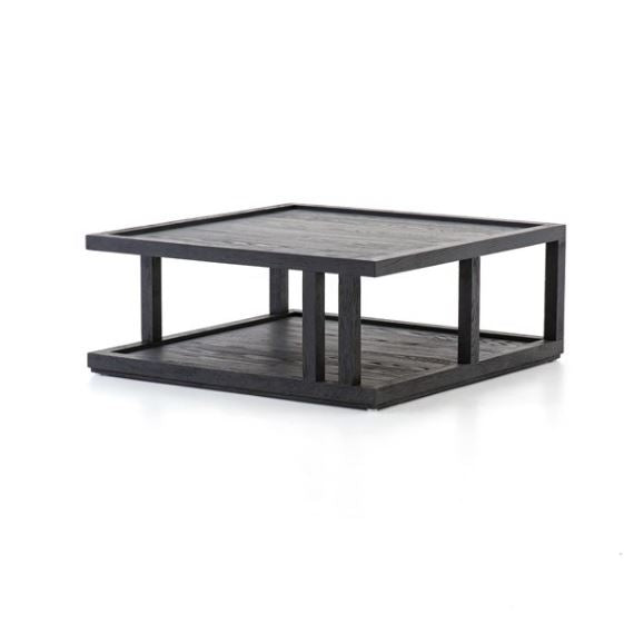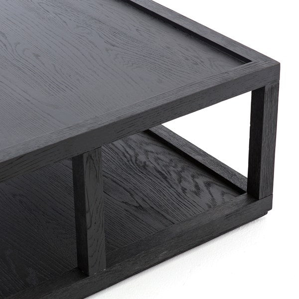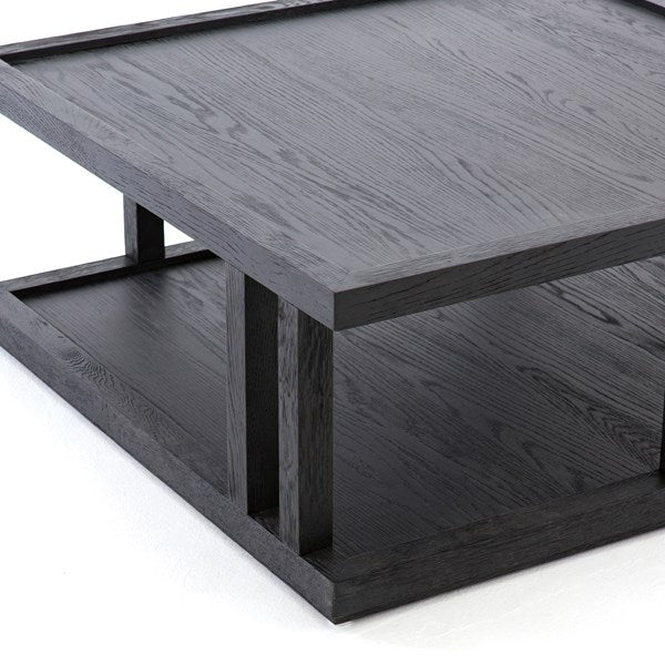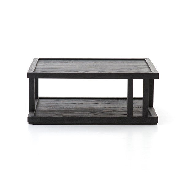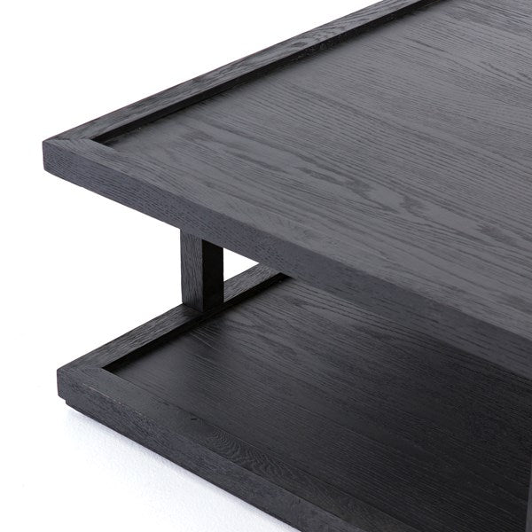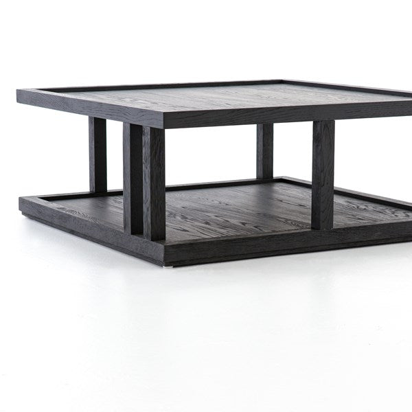 The living space centerpiece gets a geometric spin. Drifted black oak forms cleanly-mitered corners, offering two tiers of tabletop for plenty of space. Open-air styling lends a look of lightness to rustic materials.