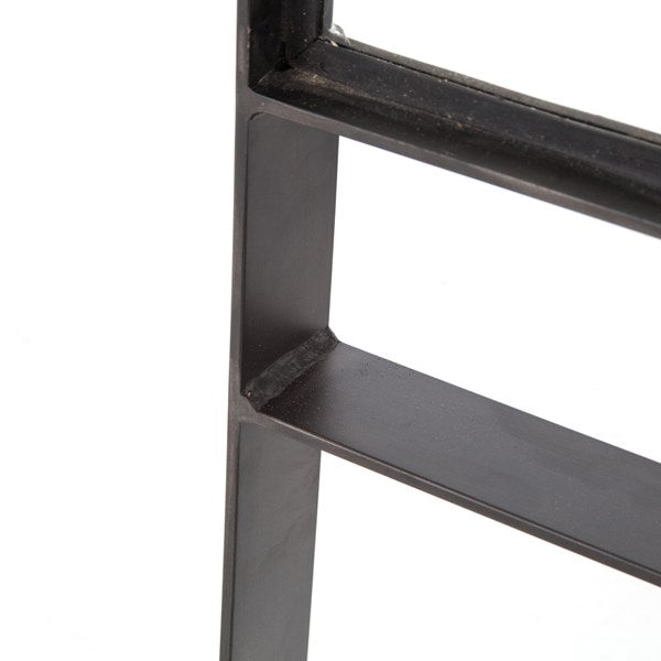 Deceptively simple waxed black iron frames a round-cornered mirror. Openwork detailing at the bottom of the thin frame lightens the look.