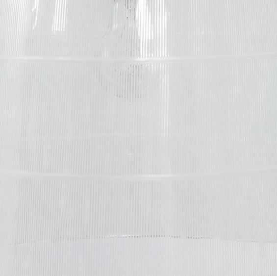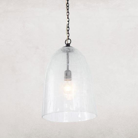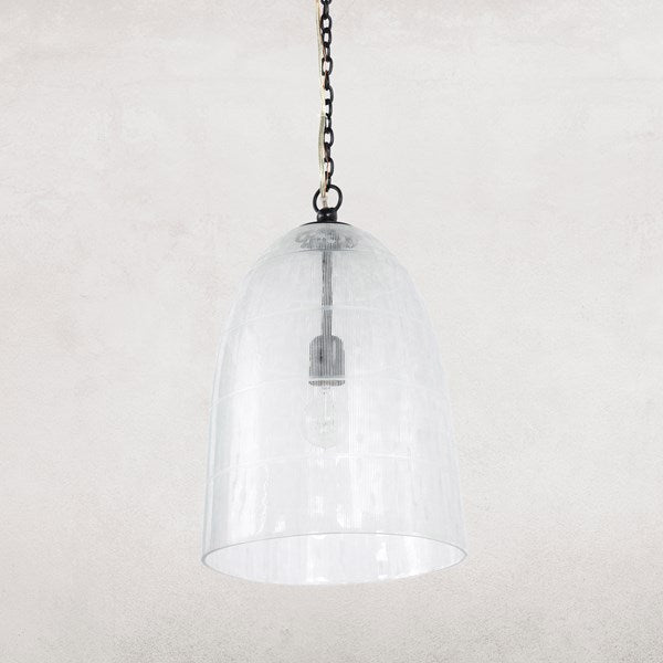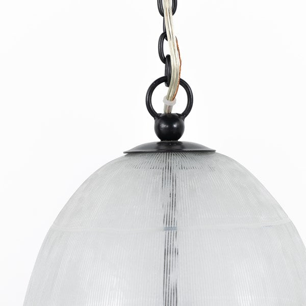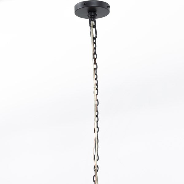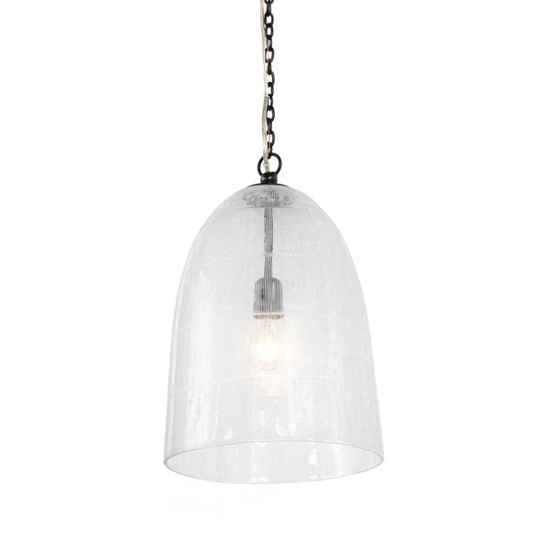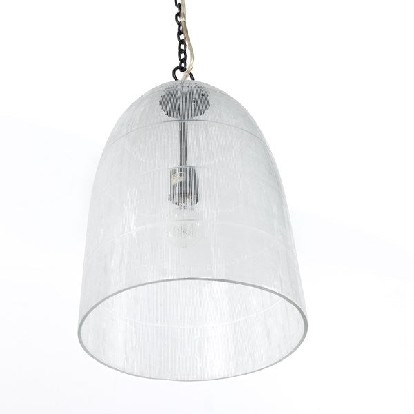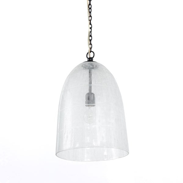 Keep it clean. A clear glass shade features hand-etching for a uniquely modern look, with an antique iron chain. Great solo - even better in multiples.