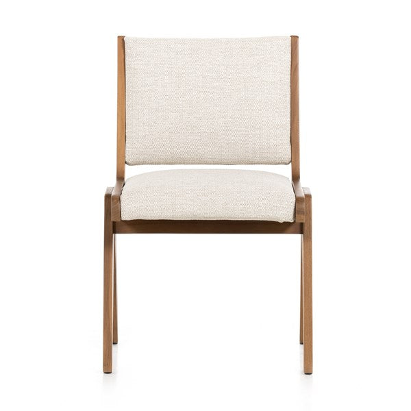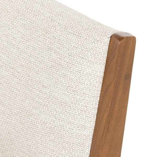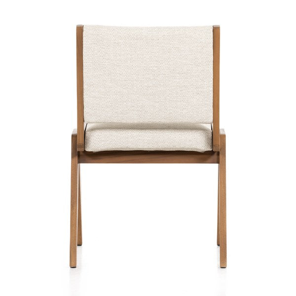 With dramatically angled legs of FSC-certified teak, outdoor-friendly upholstery readies this unique dining chair for the great outdoors. Option to pair with matching dining table. Cover or store indoors during inclement weather and when not in use.