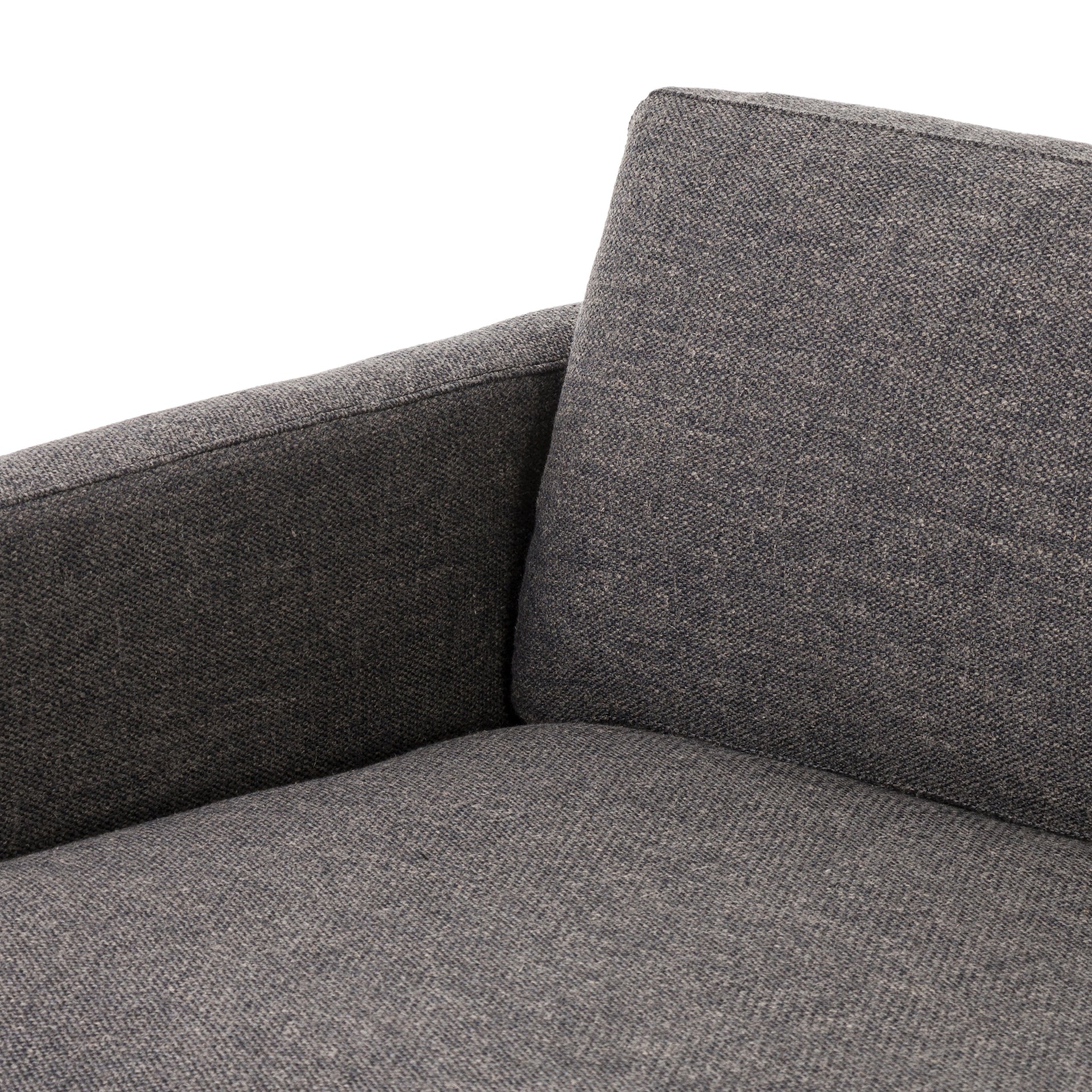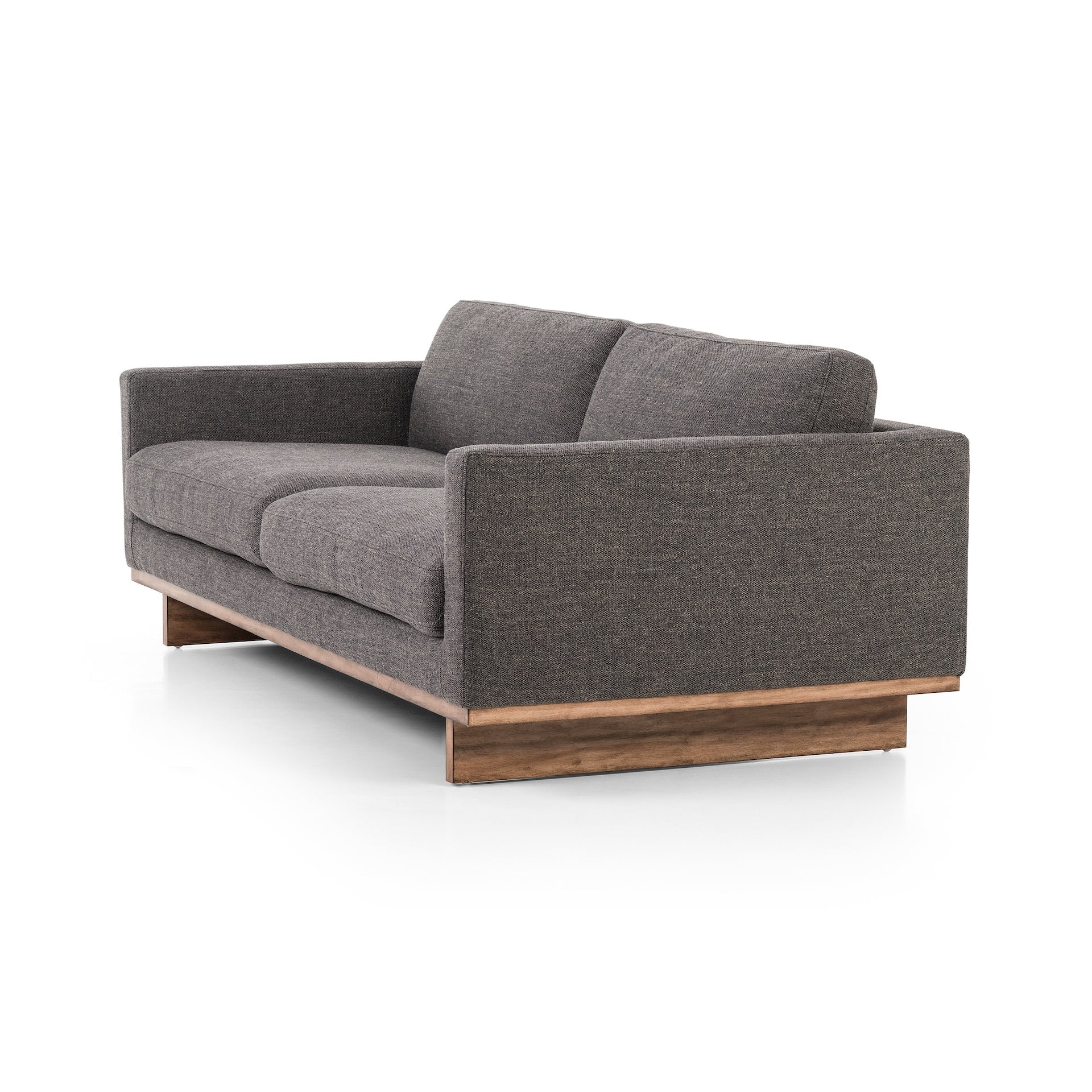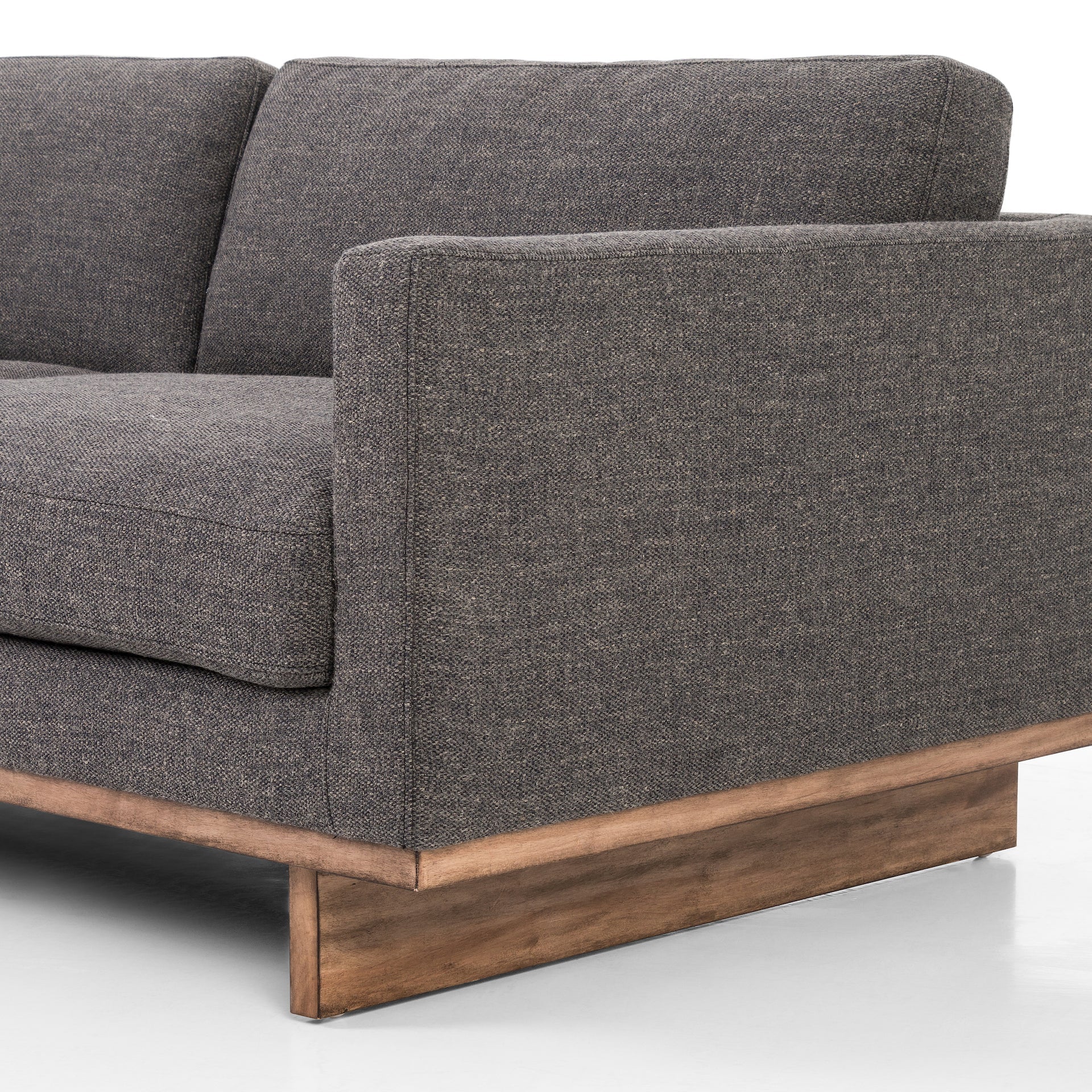 Classic goes contemporary. A wood base supports low, deep seating of performance-grade upholstery in an invitingly neutral grey, with track arms for a clean touch. Performance fabrics are specially created to withstand spills, stains, high traffic and wear, ensuring long-term comfort and unmatched durability.