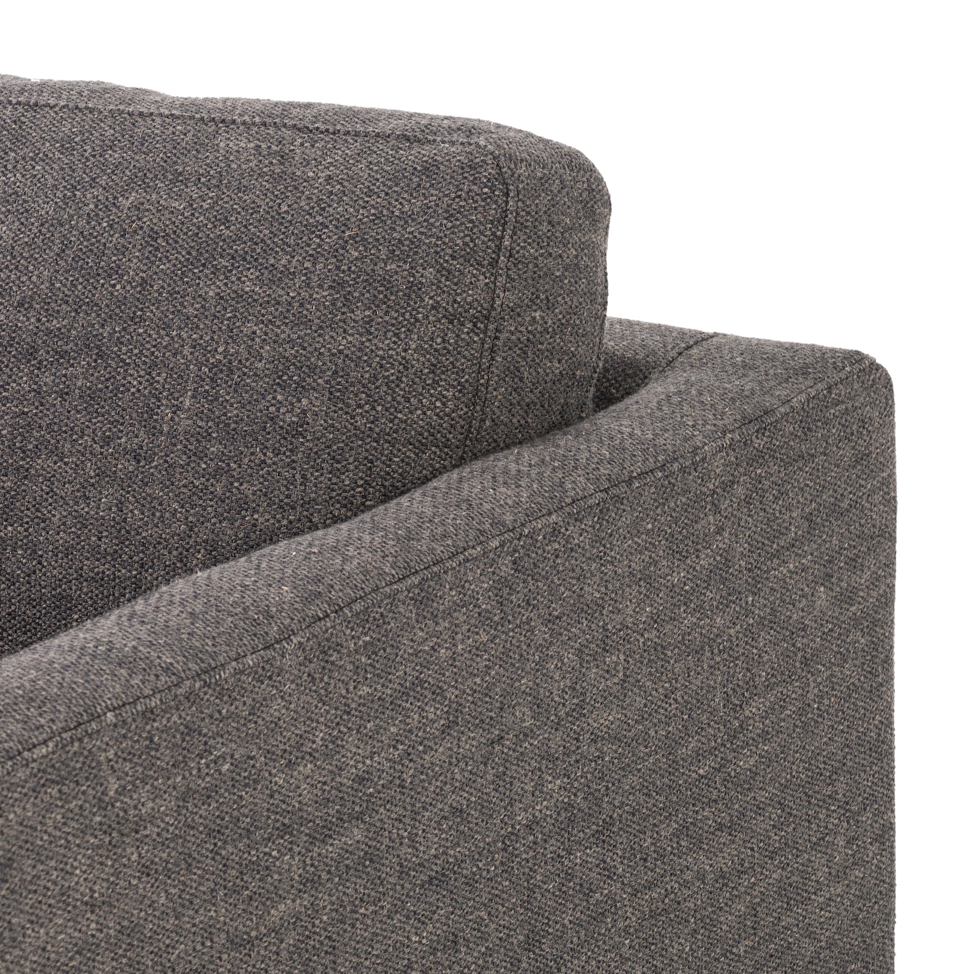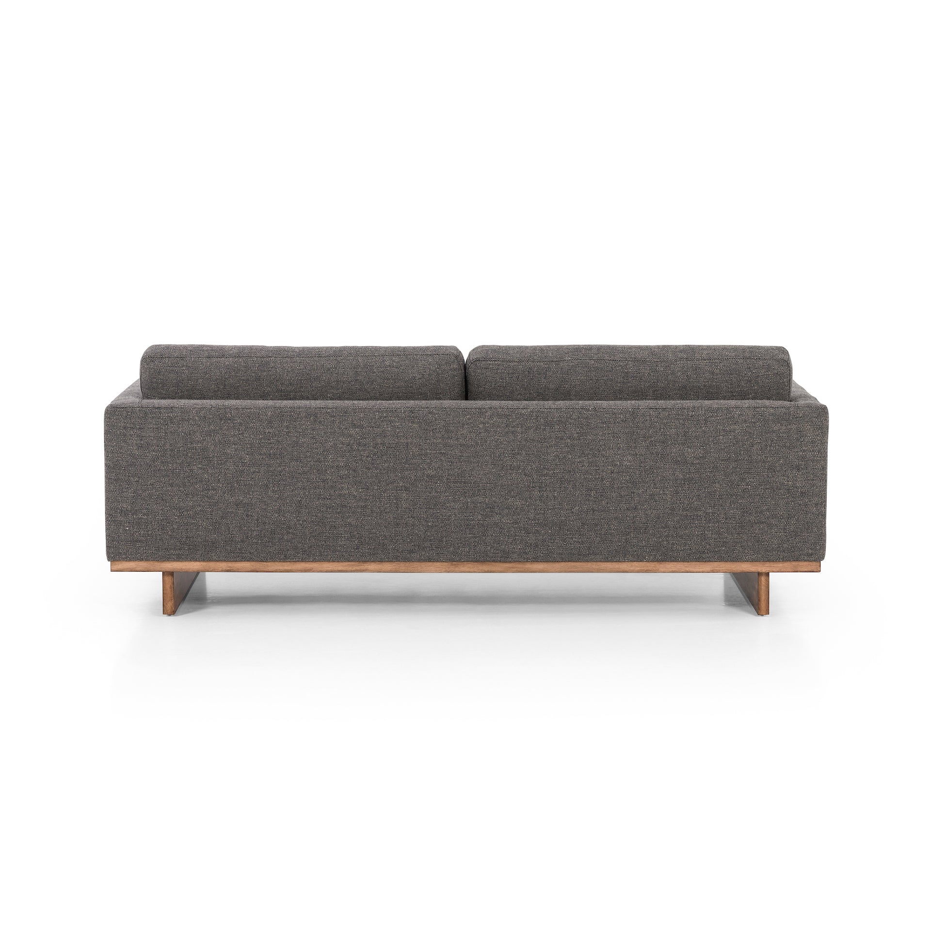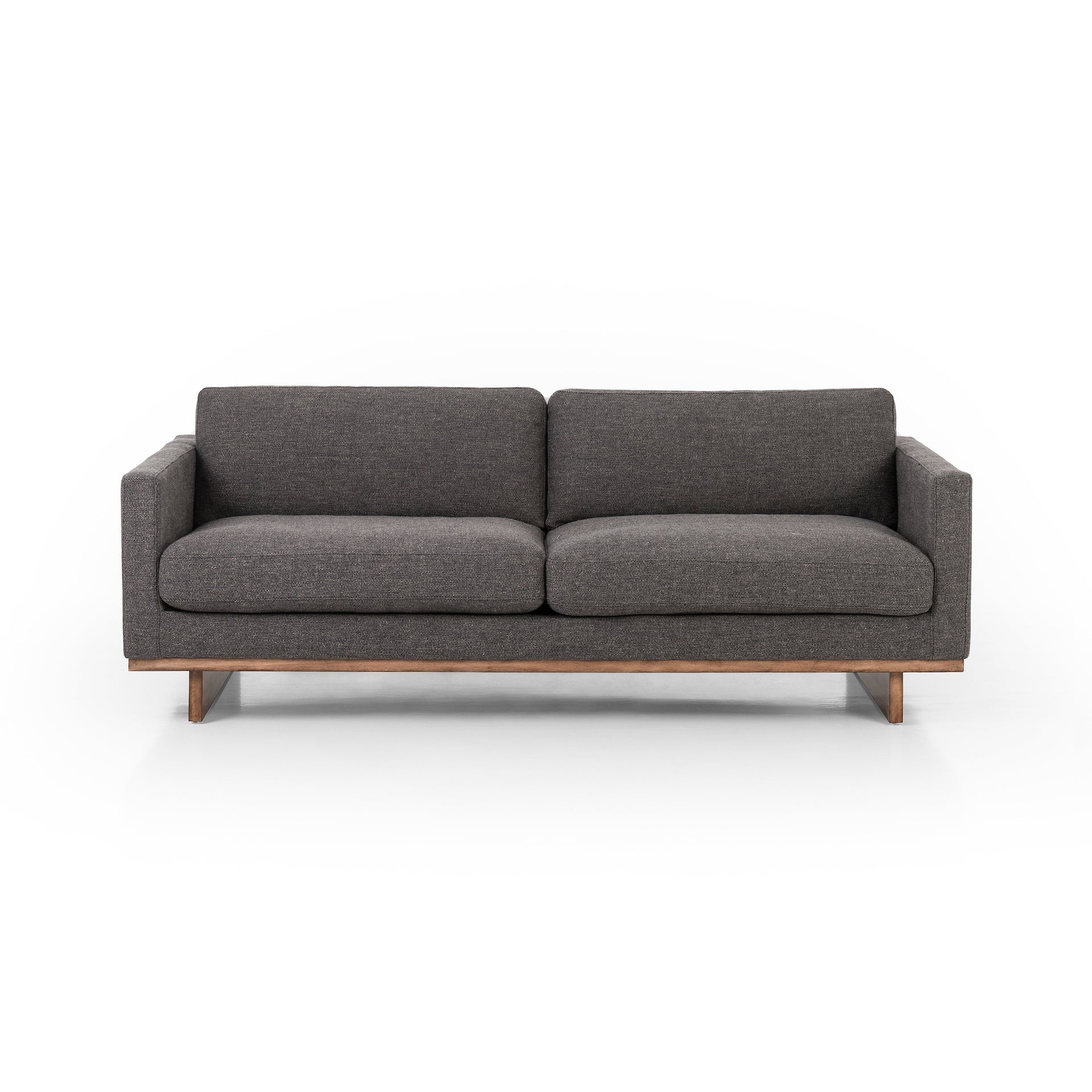 Classic goes contemporary. A wood base supports low, deep seating of performance-grade upholstery in an invitingly neutral grey, with track arms for a clean touch. Performance fabrics are specially created to withstand spills, stains, high traffic and wear, ensuring long-term comfort and unmatched durability.