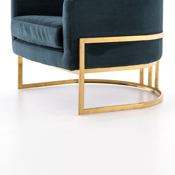 A satin brass metal frame ushers ornately seductive curves pretty enough to don as jewelry. Jasper-toned, polyester-blend upholstery lends a velvety feel and luxe look to mid-century modern seating with subtle swank.
