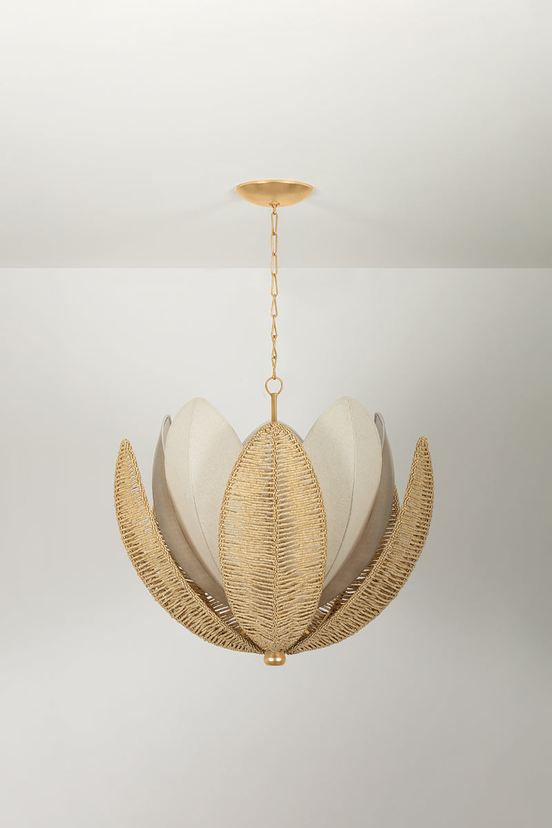 A celebration of nature, Costa Brava is the perfect blend of tropical texture and tonality. The outer shade of ‘petals’ is strung with coco shell beads, while the inner layer is woven from grained natural linen. Each petal features a center rib, creating a graceful curve to the shade. The Vintage Gold Leaf finial and canopy add a luxurious note. Available in two sizes, Costa Brava is an organic delight for any space.