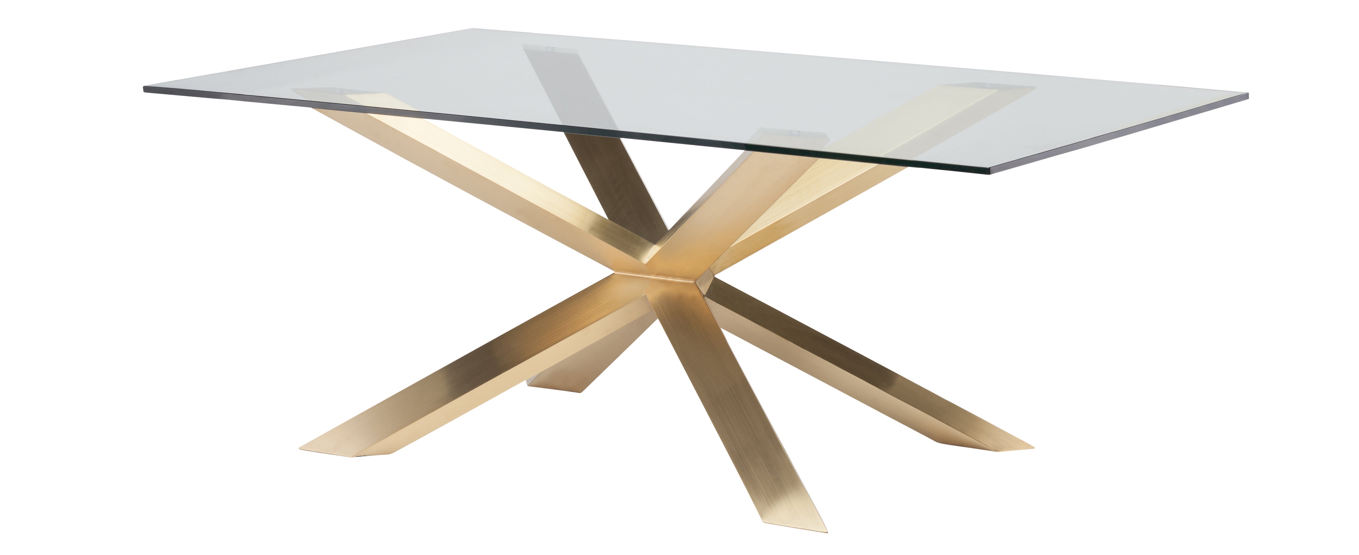 The Couture dining table is an inspired example of bold contemporary design pairing brilliant brushed gold stainless steel with clear tempered glass. The Couture's appeal lies in contrasts, the union of a dynamic steel frame with a sober handsome glass table top, the result striking.