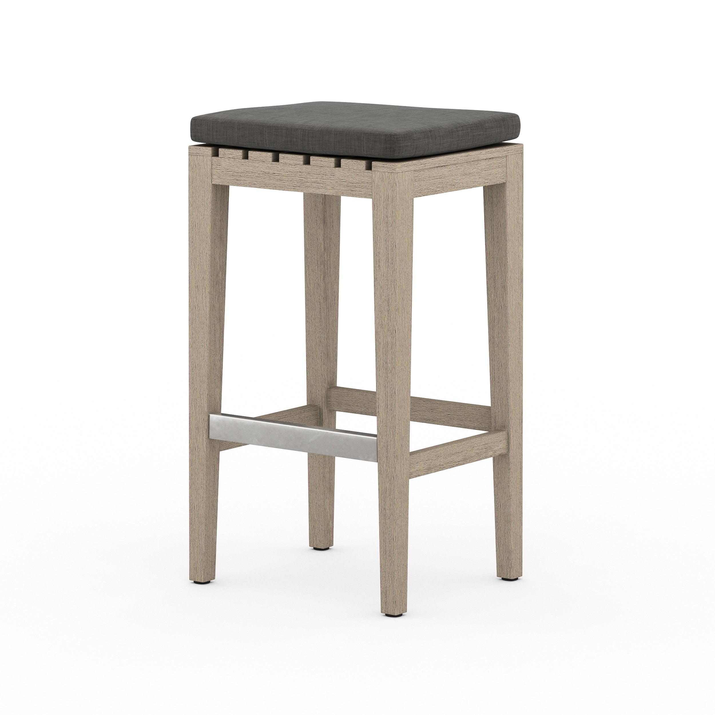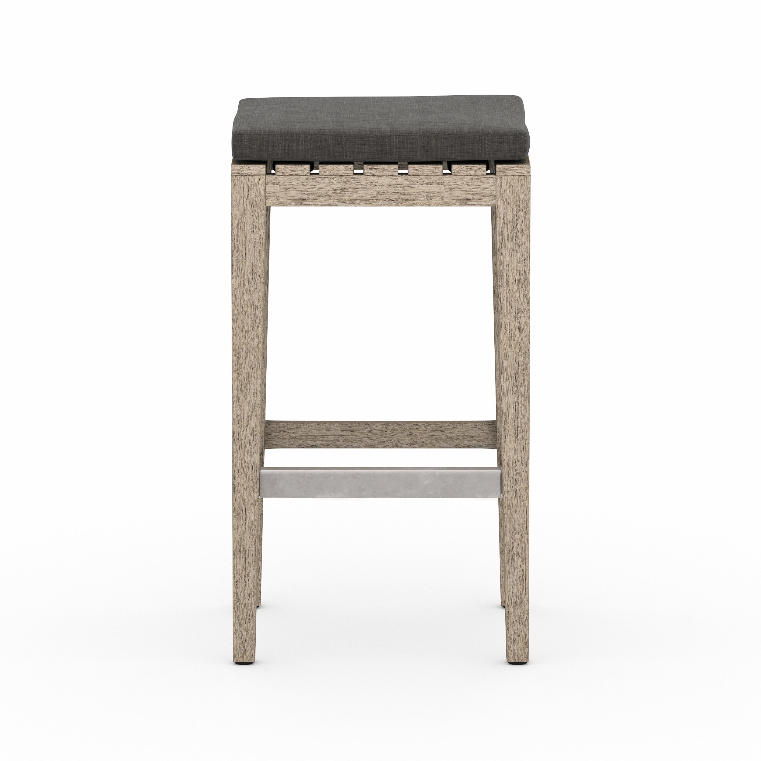 Streamlined bar styling adopts a touch of texture. Solid 100% FSC-certified teak welcomes thick seating in a UV-resistant, water-repellent, quick-drying fabric. A kickplate of brushed steel adds a modern note. Safe for outdoor spaces. Cover or store indoors during inclement weather and when not in use.