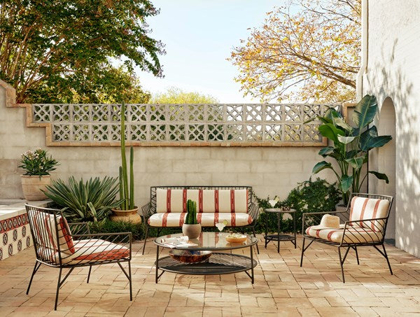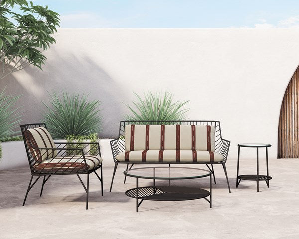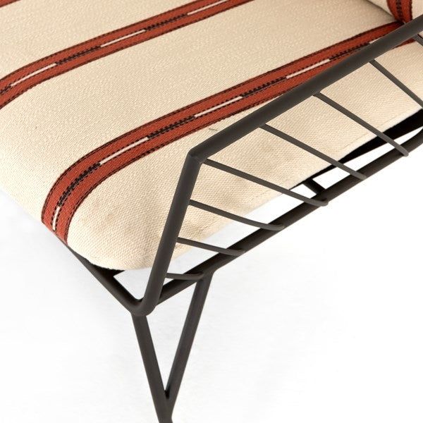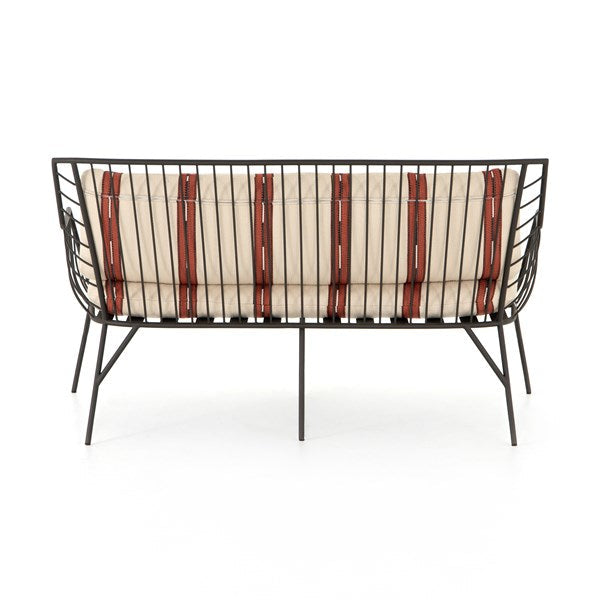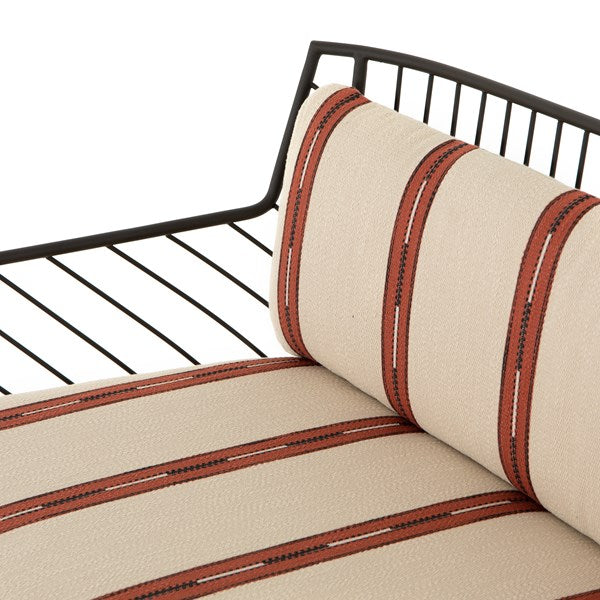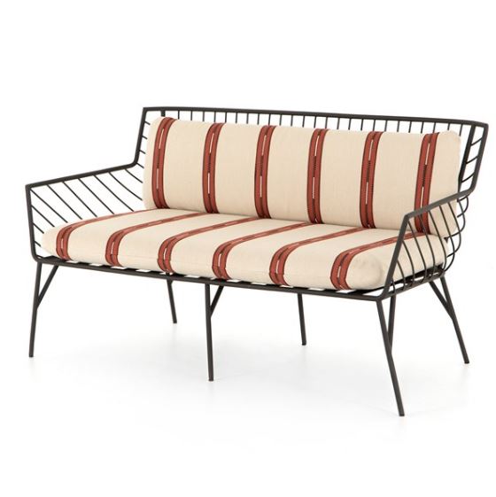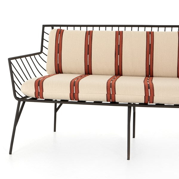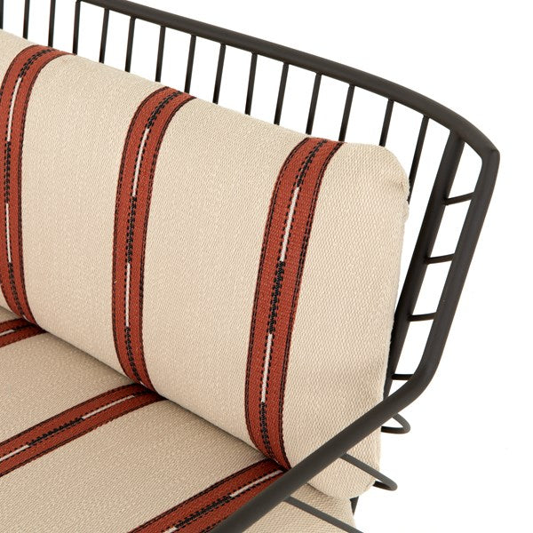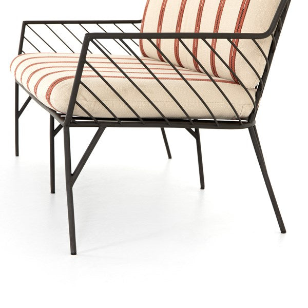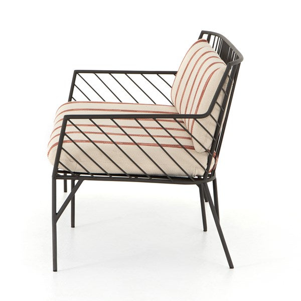 Bring a high-end feel to al fresco lounging. Open, airy framing of dark bronze-finished stainless-steel features a subtly curved back, bringing balance to an otherwise linear look. Finely tailored, knife-edged seat cushioning brings a just-right combination of comfort and elegance to the outdoors.