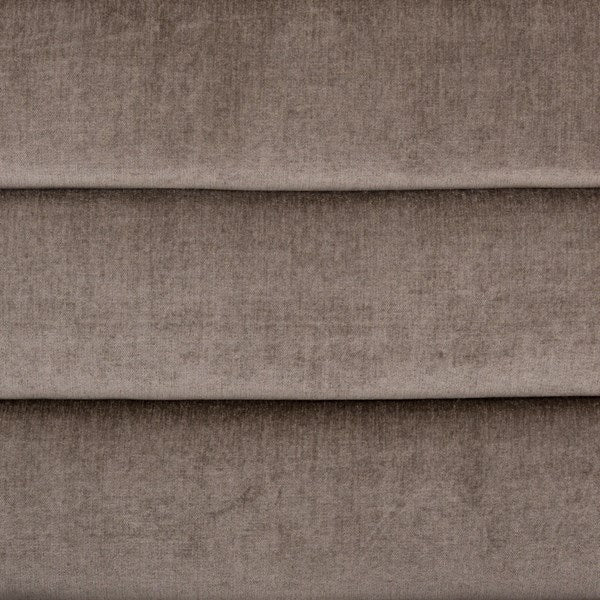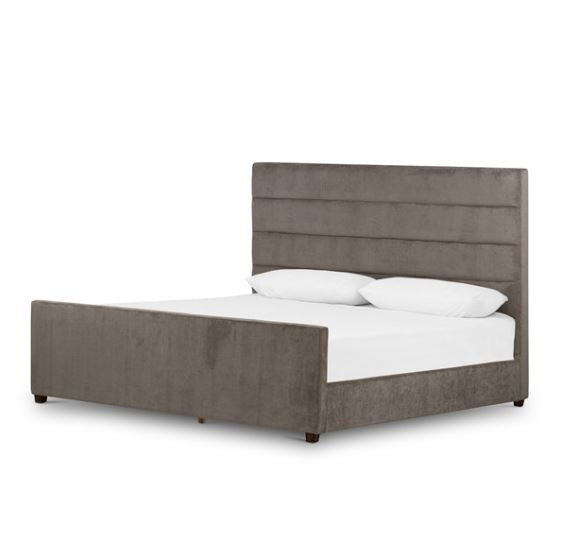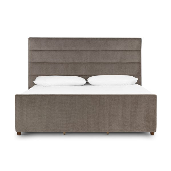 Horizontal channeling lends a linear, textured look to luxurious upholstery of silver sage polyester. Velvety, high-style headboard crafts an elegant air.