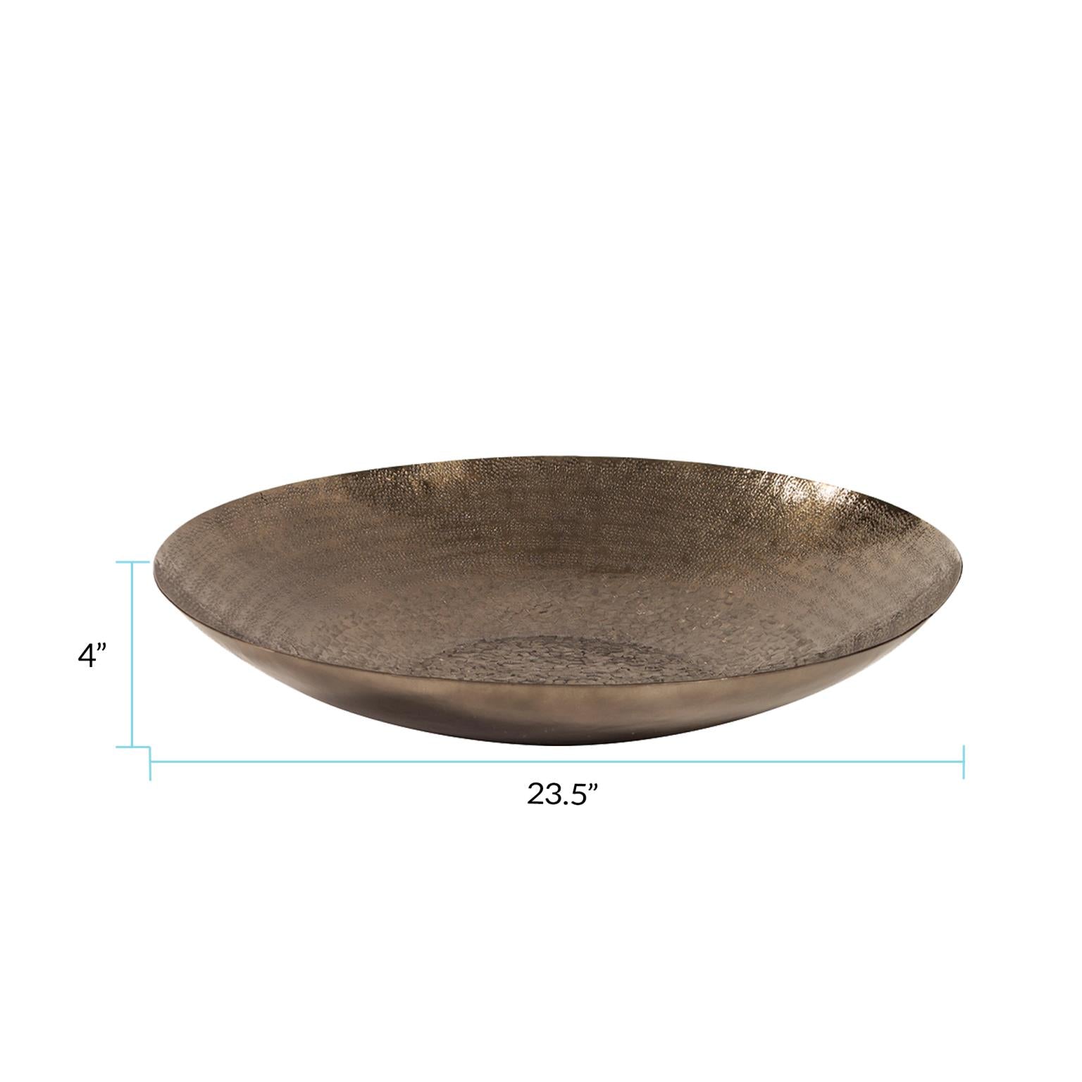 This unique charger is fashioned from metal and features a chiseled texture. It is finished in a metallic deep bronze. Console tables, book shelves, desks or any other place that an accent is needed, are the perfect places for this decorative bowl. But that's not all! This piece comes with hardware so that you can hang it on the wall for a sculptural wall art piece! Pair with the smaller, gold piece for a striking collection on your wall or table! *For decoration ONLY. Item is NOT food safe or suitable to hold water.