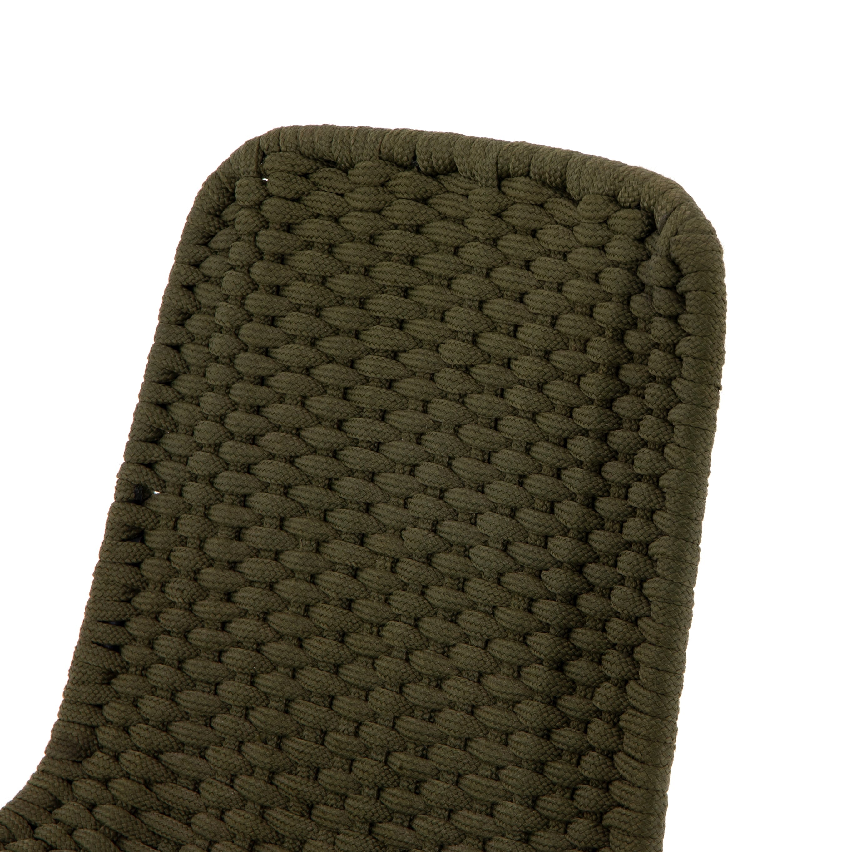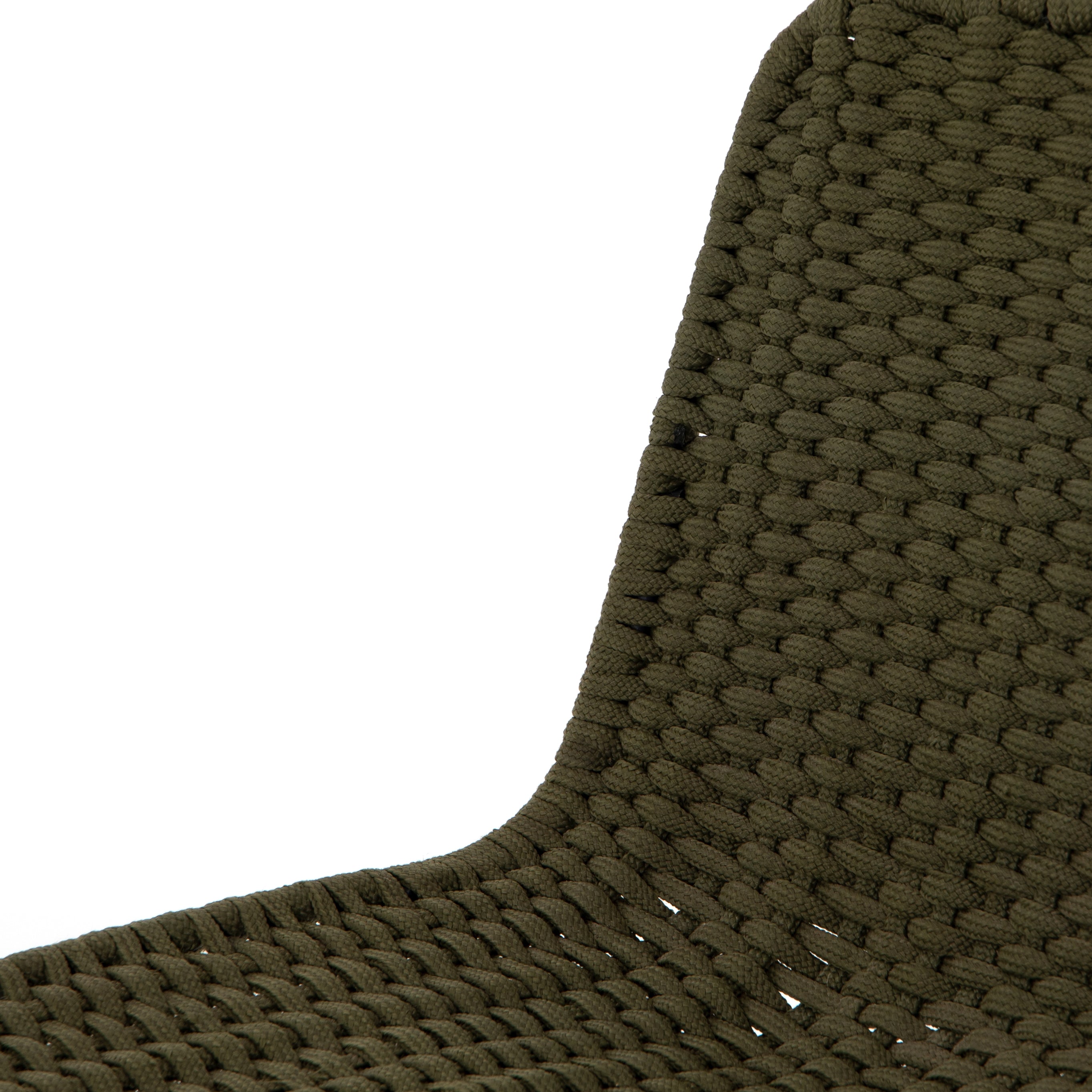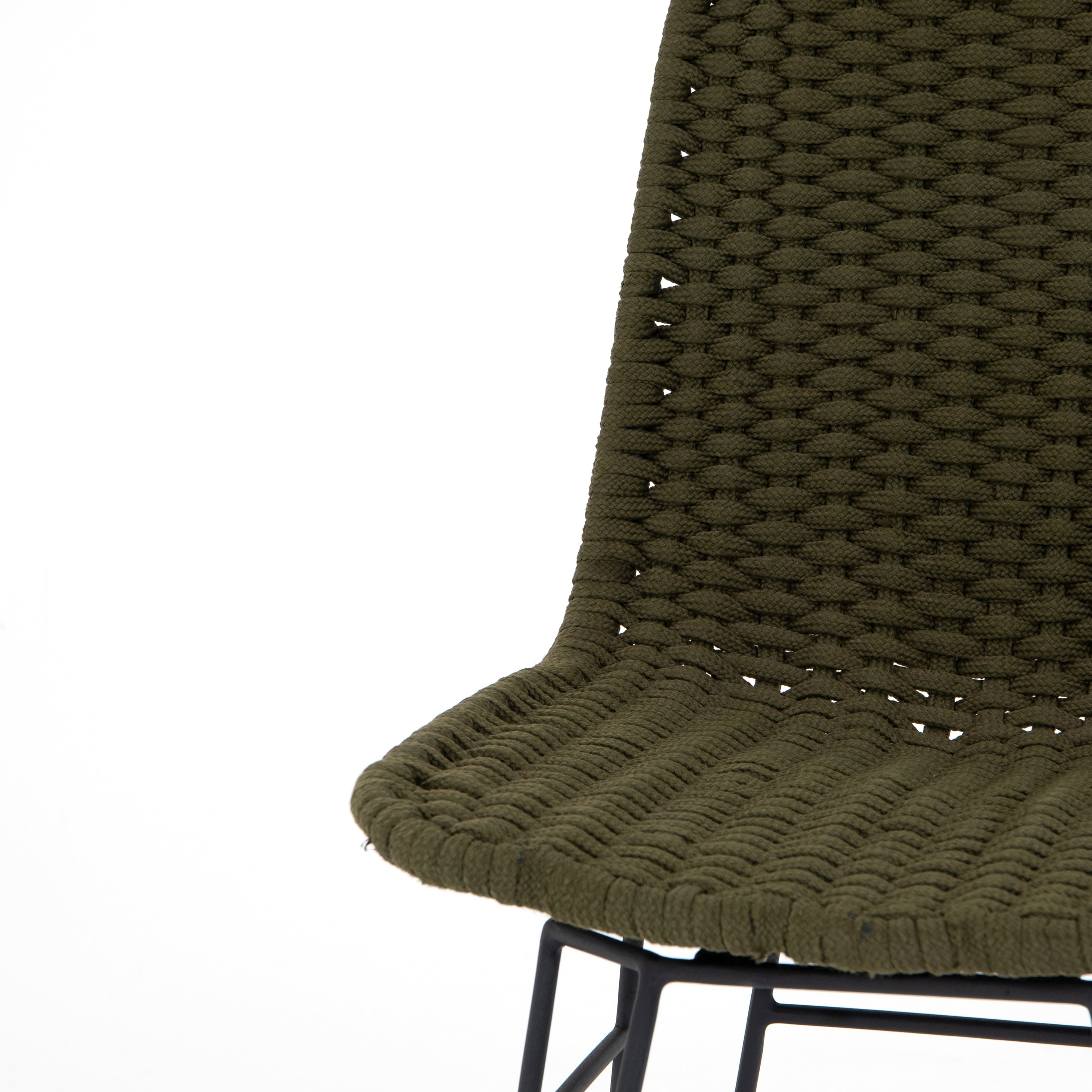 Armless olive seating weaves for fresh texture, with black hairpin legs and a swivel adding a fashion-forward touch. Cover or store indoors during inclement weather and when not in use.