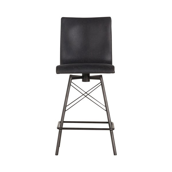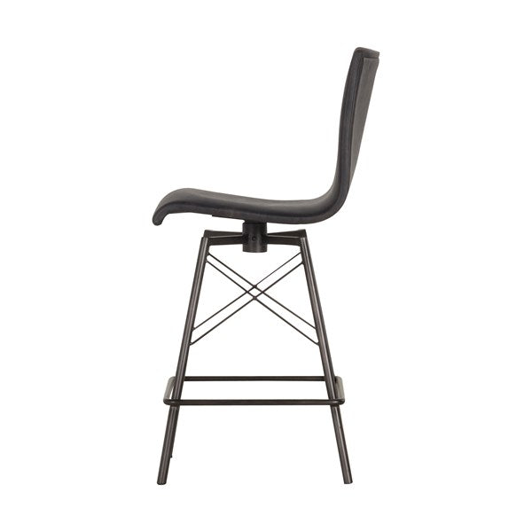 Mid-century styling brings beauty to the bar or breakfast nook. Modern S-curves in distressed black leather swivel 360 degrees above an architectural, black-waxed iron base.