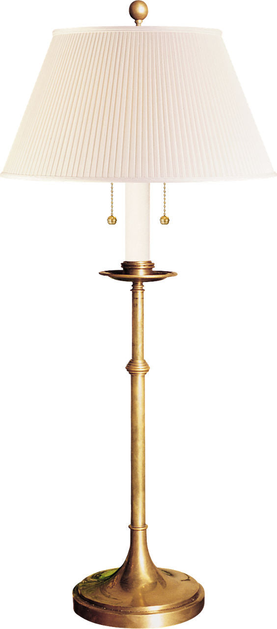 The Dorchester Club Table Lamp features a classic design with a round base and a fabric shade. It requires two E26 bulbs with a wattage of 40 each. The lamp has a pull chain switch and is available in an antique-burnished brass finish. The shade dimensions are 11.5\