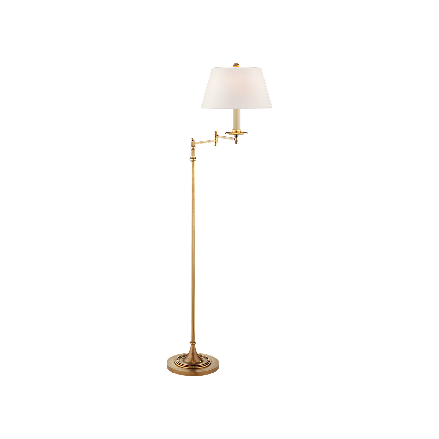 The Dorchester Swing Arm Pharmacy Floor Lamp provides focused lighting with an adjustable swing arm. Its classic design is suitable for a variety of interior styles. It features a round base and a sleek silhouette. This floor lamp is a practical and stylish addition to any room.
