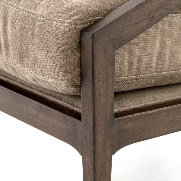 A modern ode to popular mid-century design. Burnt oak is hand-shaped to deliver clean, linear structure to plush seating in unique silver sage. Perfect paired in office or living area.