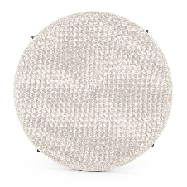 Stylish versatility. An airy base of gunmetal-finished iron supports rounded beech wood with textural wheat-colored upholstery. Perfectly scaled to create additional seating or an extra surface when topped with a tray.