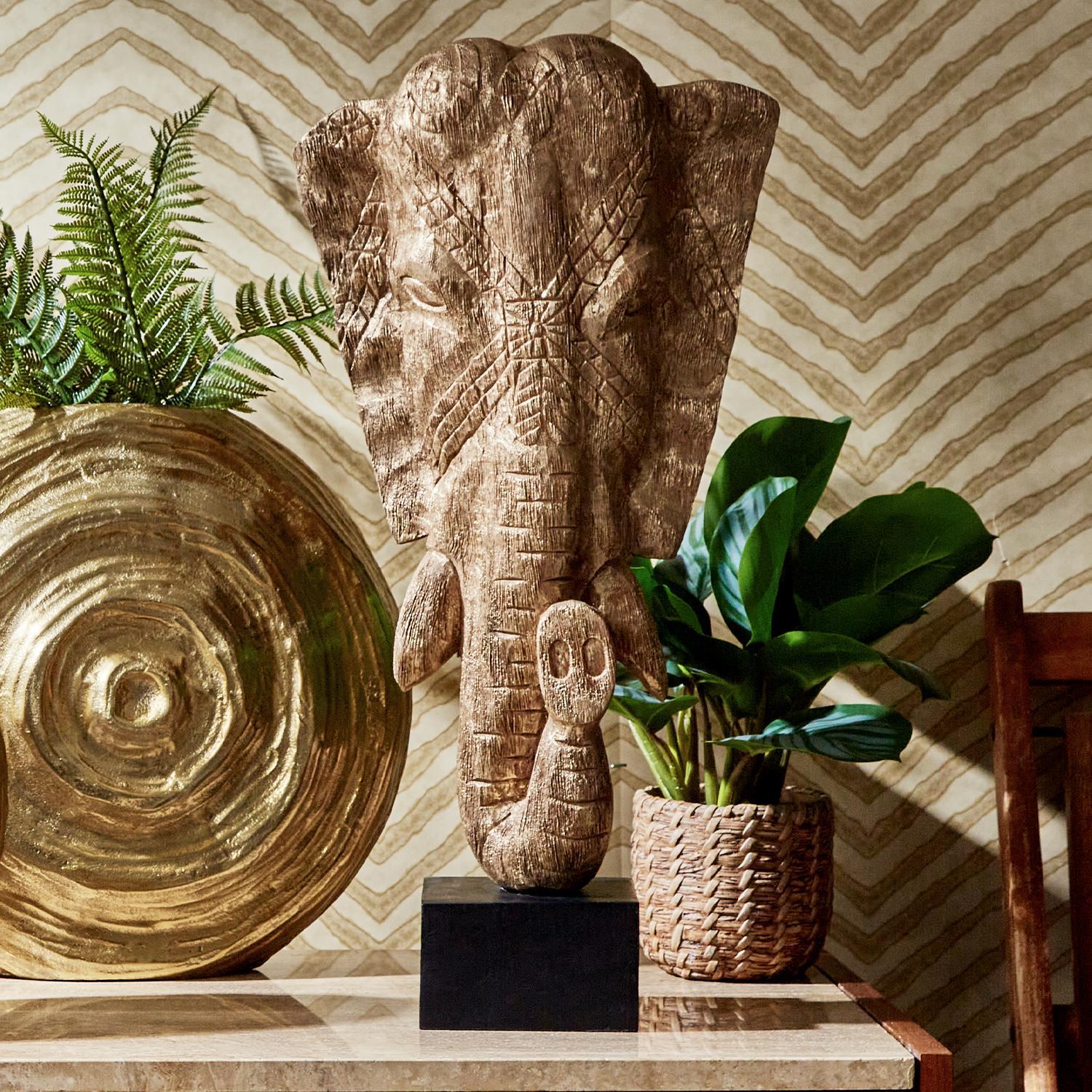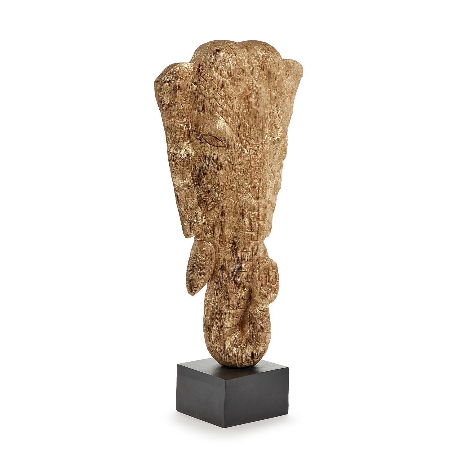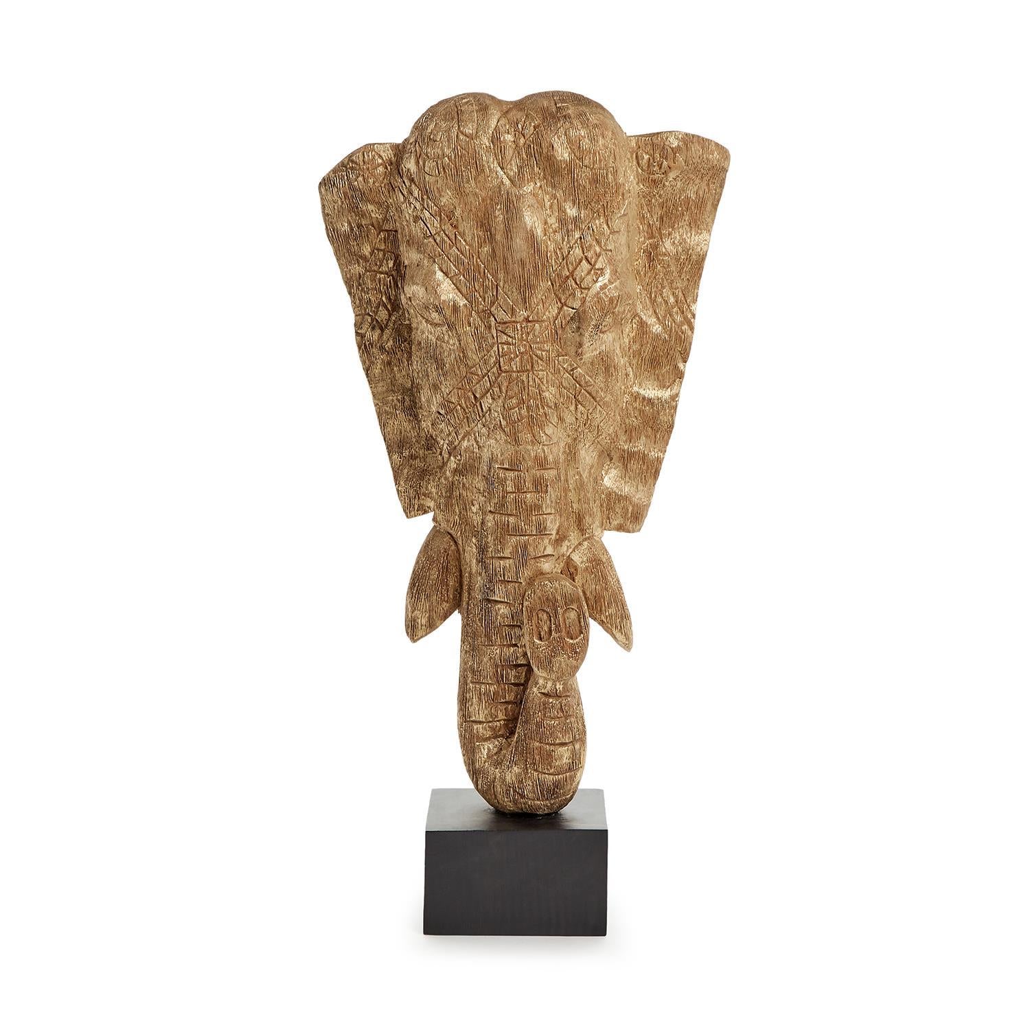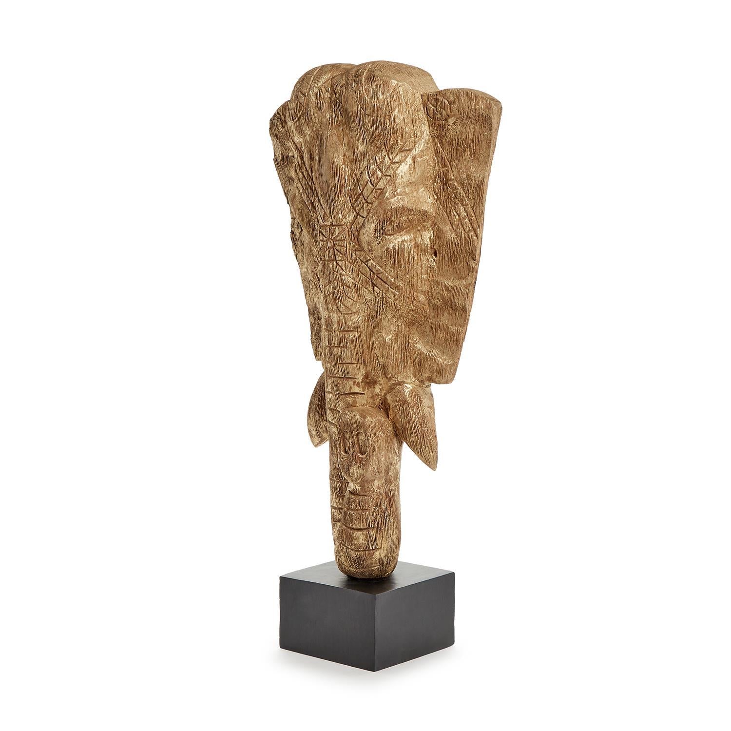 Add a touch of exotic allure to your space with this stunning elephant head sculpture. Handcrafted from mango wood, each piece is a unique work of art, showcasing natural color variations and small fissures that add to its charm. Resting on a sleek black stand, this elegant sculpture stands at 23 inches tall, making it a captivating focal point for any room.