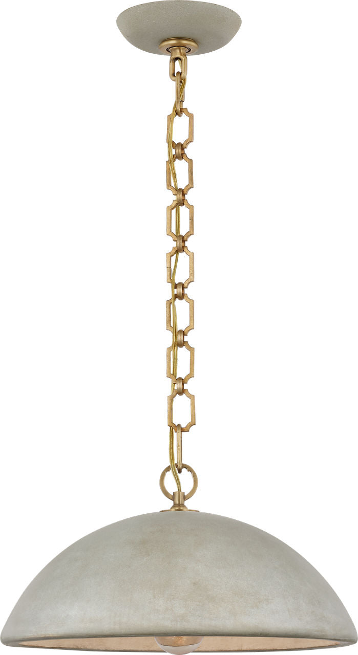 The sculptural Elliot by Suzanne Kasler presents a rugged-yet-refined silhouette in lightweight concrete. The unexpected material's smooth, inverted dome hangs from a slender chain and casts a light that's ideal over kitchen islands or dining room tables.