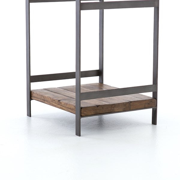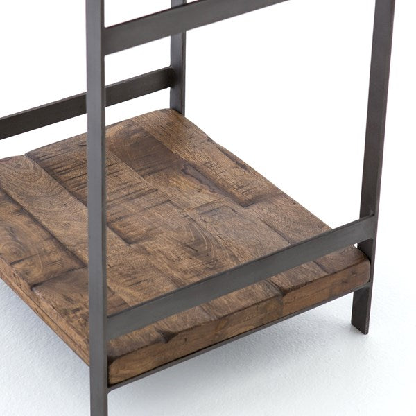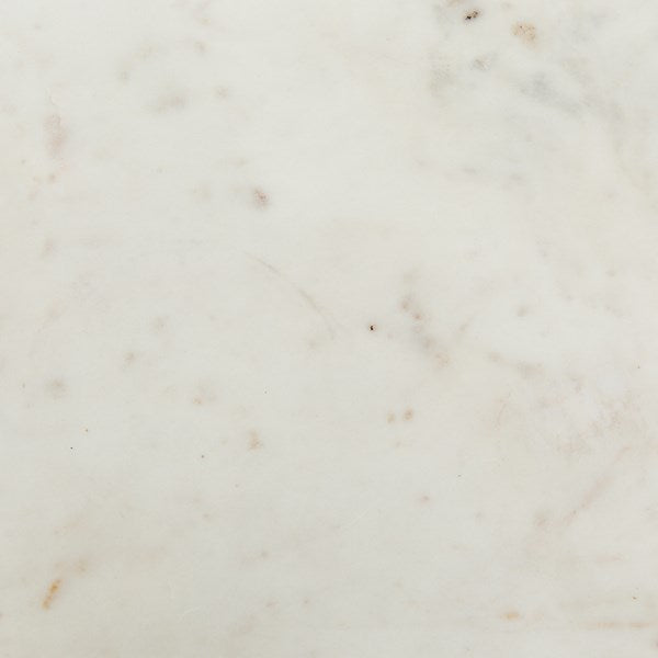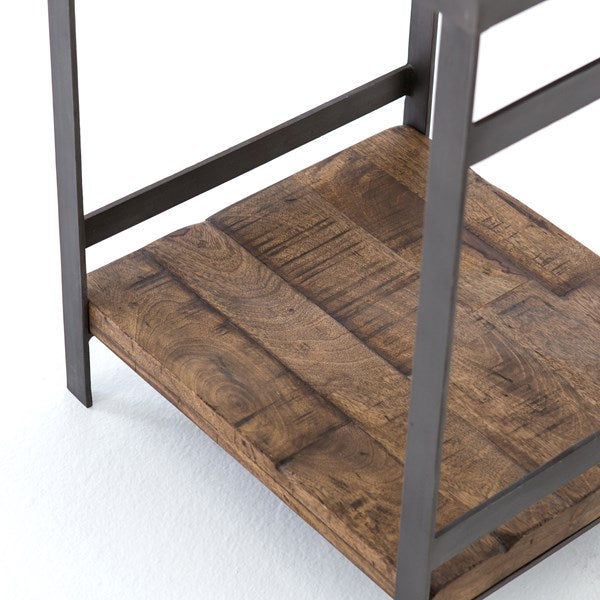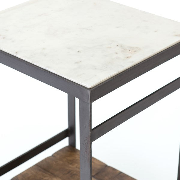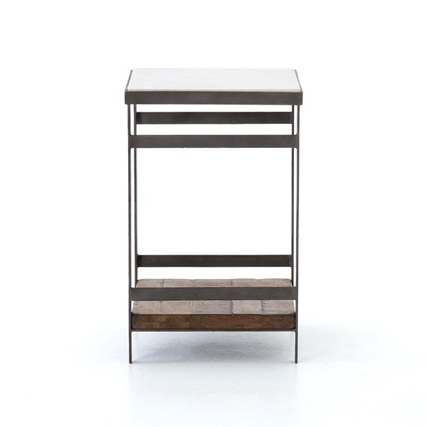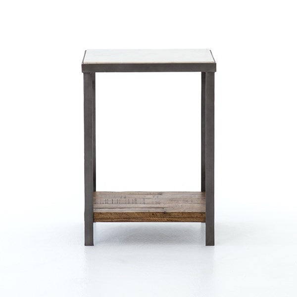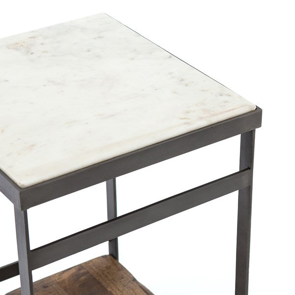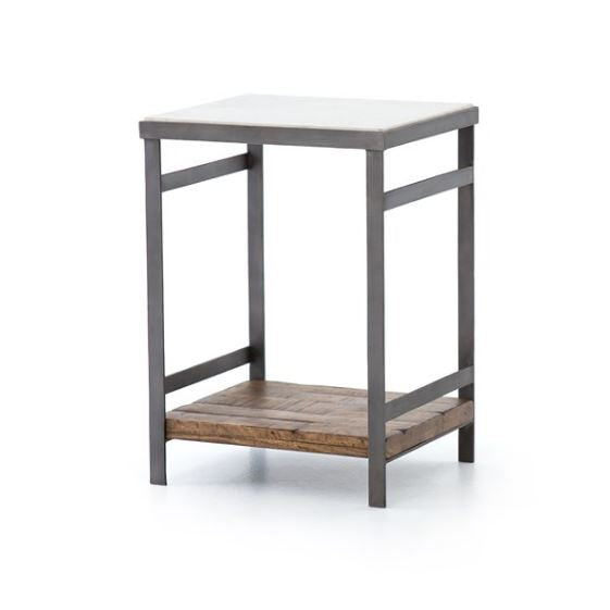 Industrial appeal. Simple construction of flat stock iron and weathered mango wood contrasts with a sleek white marble top and offers handy bedside storage.