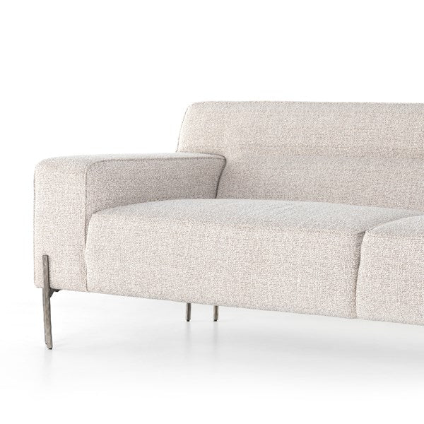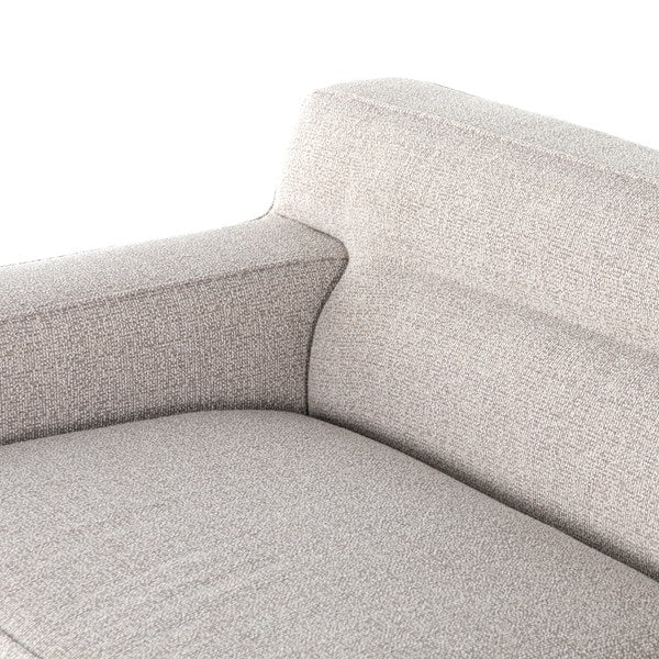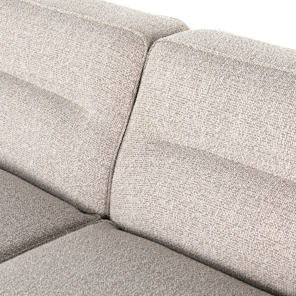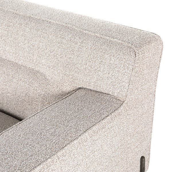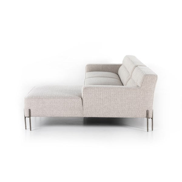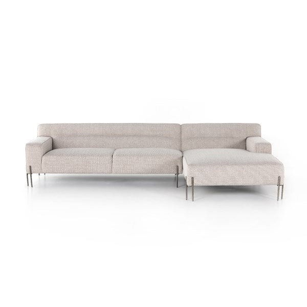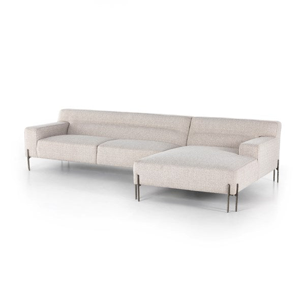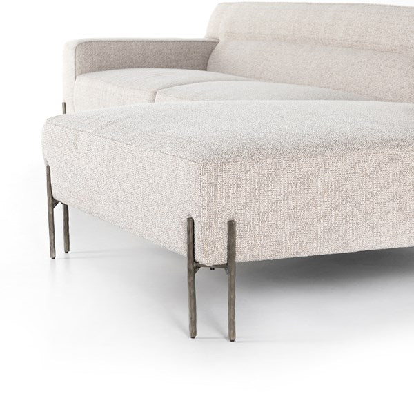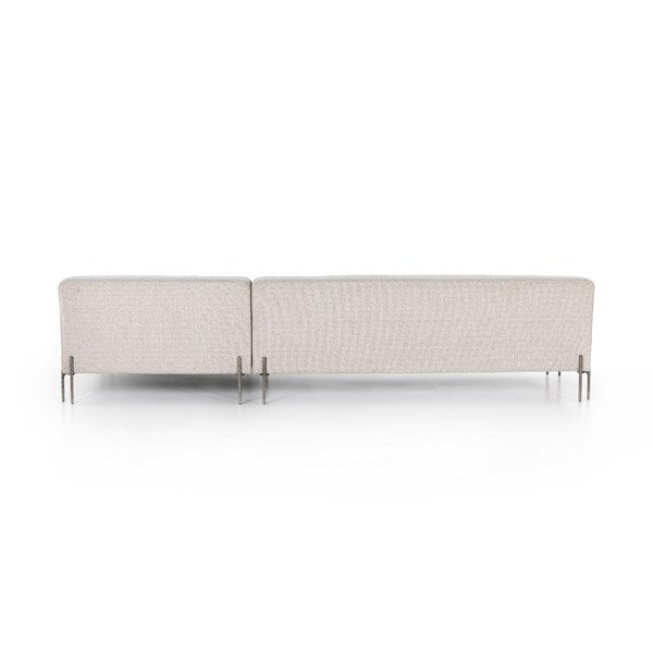 Feminine and finely tailored, double-stacked back banding draws the eye in and keeps it moving, with light grey high-performance upholstery for modern ease. Slate-brushed iron legs are hand-hammered for a touch of texture. Two-piece right arm-facing sectional with matching chaise.