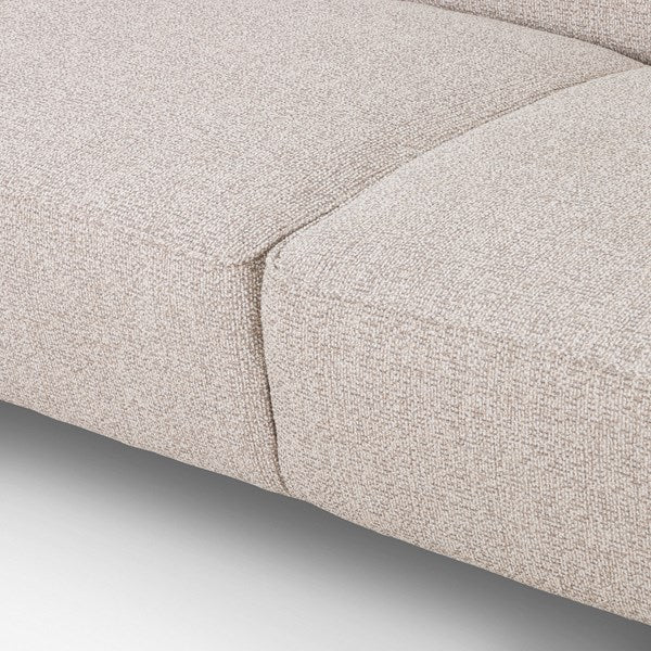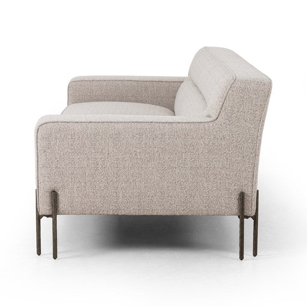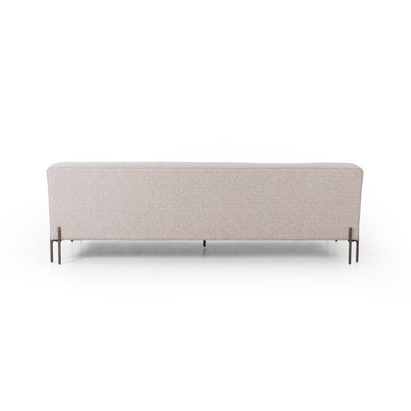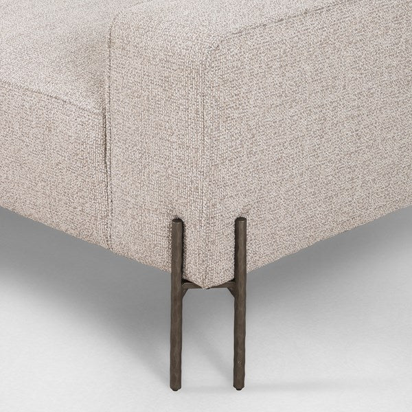 Feminine and finely tailored, double-stacked back banding draws the eye in and keeps it moving, with light grey high-performance upholstery for modern ease. Slate-brushed iron legs are hand-hammered for a touch of texture.