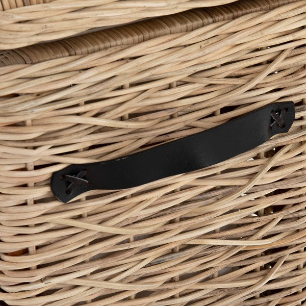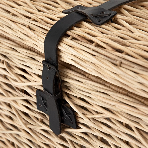 Cross-woven rattan trunk, perfect for the stylish storage of extra blankets, clothing, toys, or seasonal decor. Cotton-lined, with top-grain leather buckles for closure.