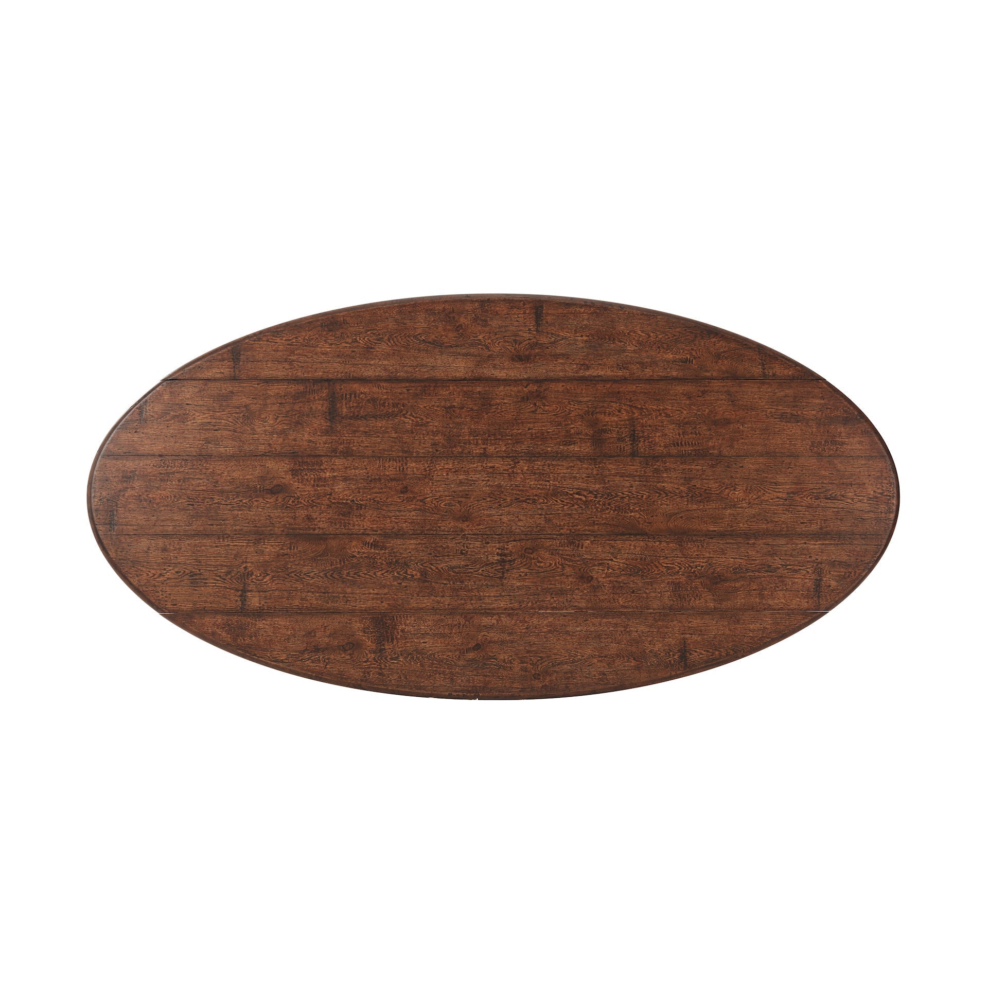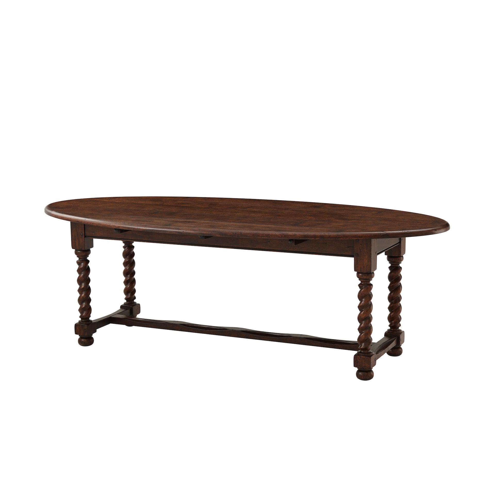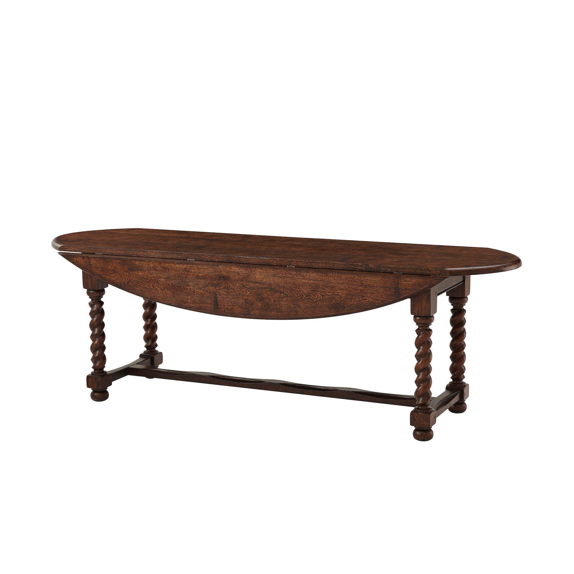 A drop leaf dining table featuring an oval rustic oak veneered top on four spiral columns joined by chipped carved stretcher. When leaves are dropped, this lovely piece can be used as a large console table.