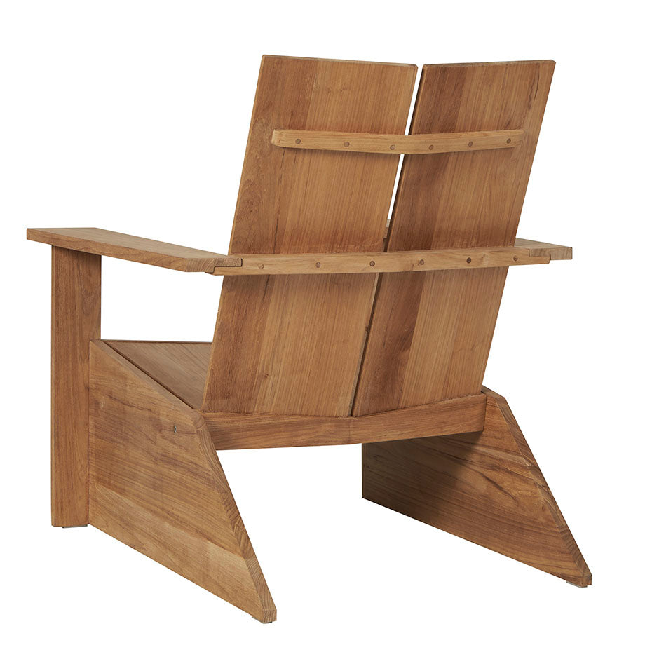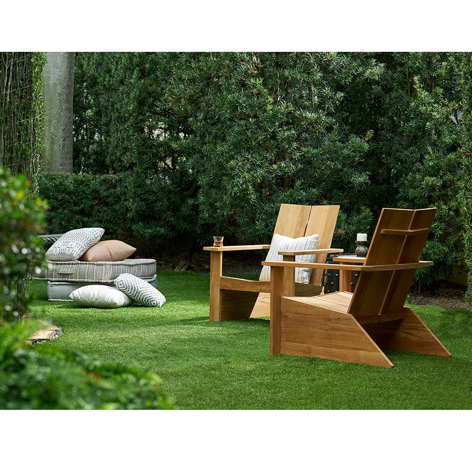 Inspired by the dynamic personality and lifestyle of Ernest Hemingway, the Ernest Adirondack Chair features a modern design with wide, tapered track arms, a solid marine A-grade Indonesian teak frame, and a natural teak finish. The chair includes a solid teak seat deck, providing durability and comfort. With dimensions of 38 inches in height, 35 inches in width, and 37 inches in depth, it is designed for both style and relaxation.