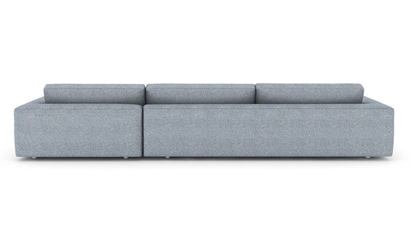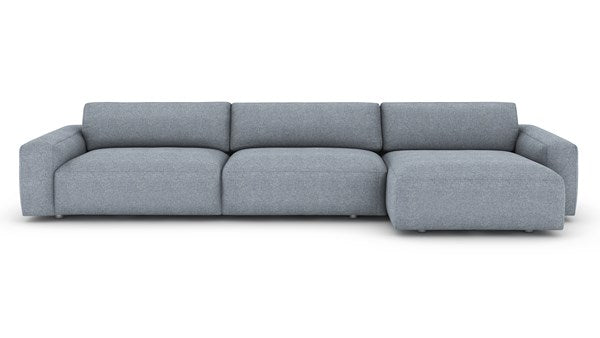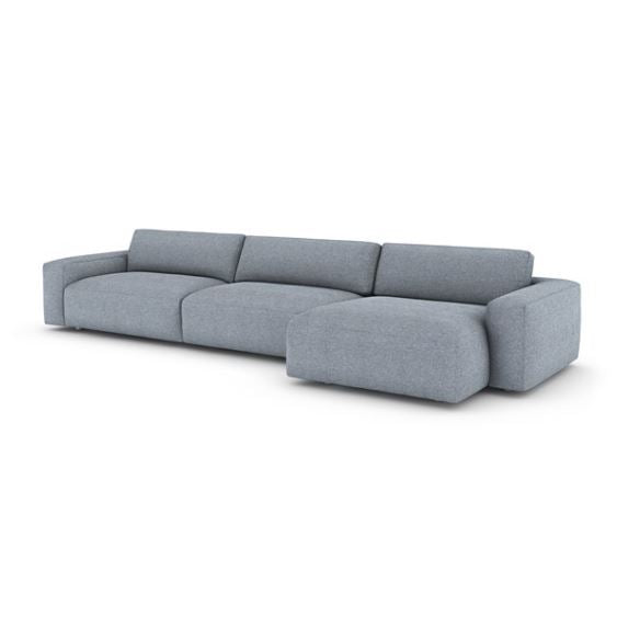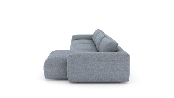 Billowy comfort and exaggerated proportions bring fresh European vibes to everyday lounging, with loose feather-blend back cushions and overfilled arms doling structure and softness alike. Upholstered in an inviting navy-colored fabric made from recycled plastic water bottles, generous seat depth feels prime for lounging. Zigzag sinuous spring wire suspension applied under cushioning to eliminate sagging, evenly distribute weight and create consistent firmness. Sectional pieces attach securely with alligator clip connectors.