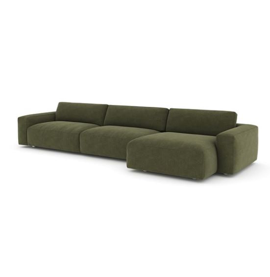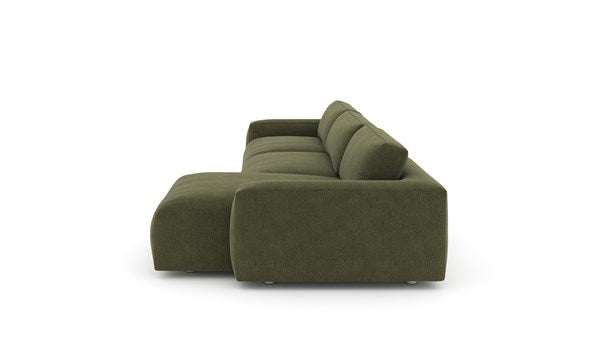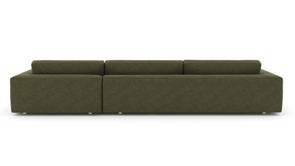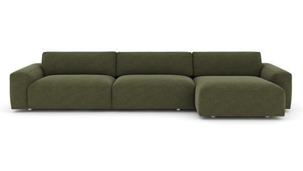 Billowy comfort and exaggerated proportions bring fresh European vibes to everyday lounging, with loose feather-blend back cushions and overfilled arms doling structure and softness alike. Upholstered in an inviting emerald-colored fabric made from recycled plastic water bottles, generous seat depth feels prime for lounging. Zigzag sinuous spring wire suspension applied under cushioning to eliminate sagging, evenly distribute weight and create consistent firmness. Sectional pieces attach securely with alligator clip connectors.