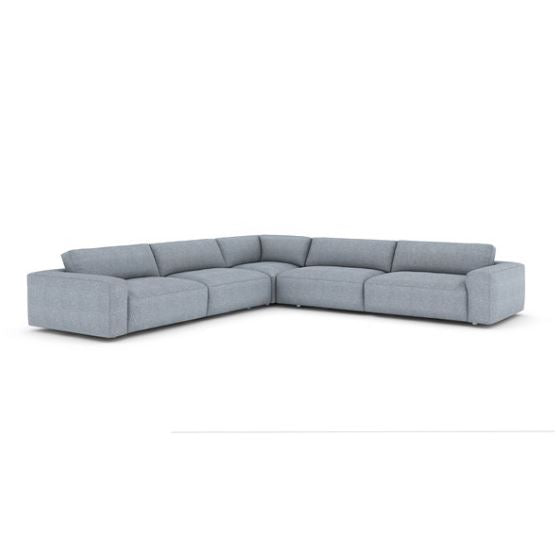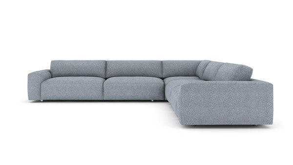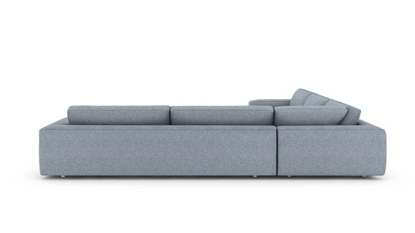 Billowy comfort and exaggerated proportions bring fresh European vibes to everyday lounging, with loose feather-blend back cushions and overfilled arms doling structure and softness alike. Upholstered in an inviting navy-colored fabric made from recycled plastic water bottles, generous seat depth feels prime for lounging. Zigzag sinuous spring wire suspension applied under cushioning to eliminate sagging, evenly distribute weight and create consistent firmness. Sectional pieces attach securely with alligator clip connectors.