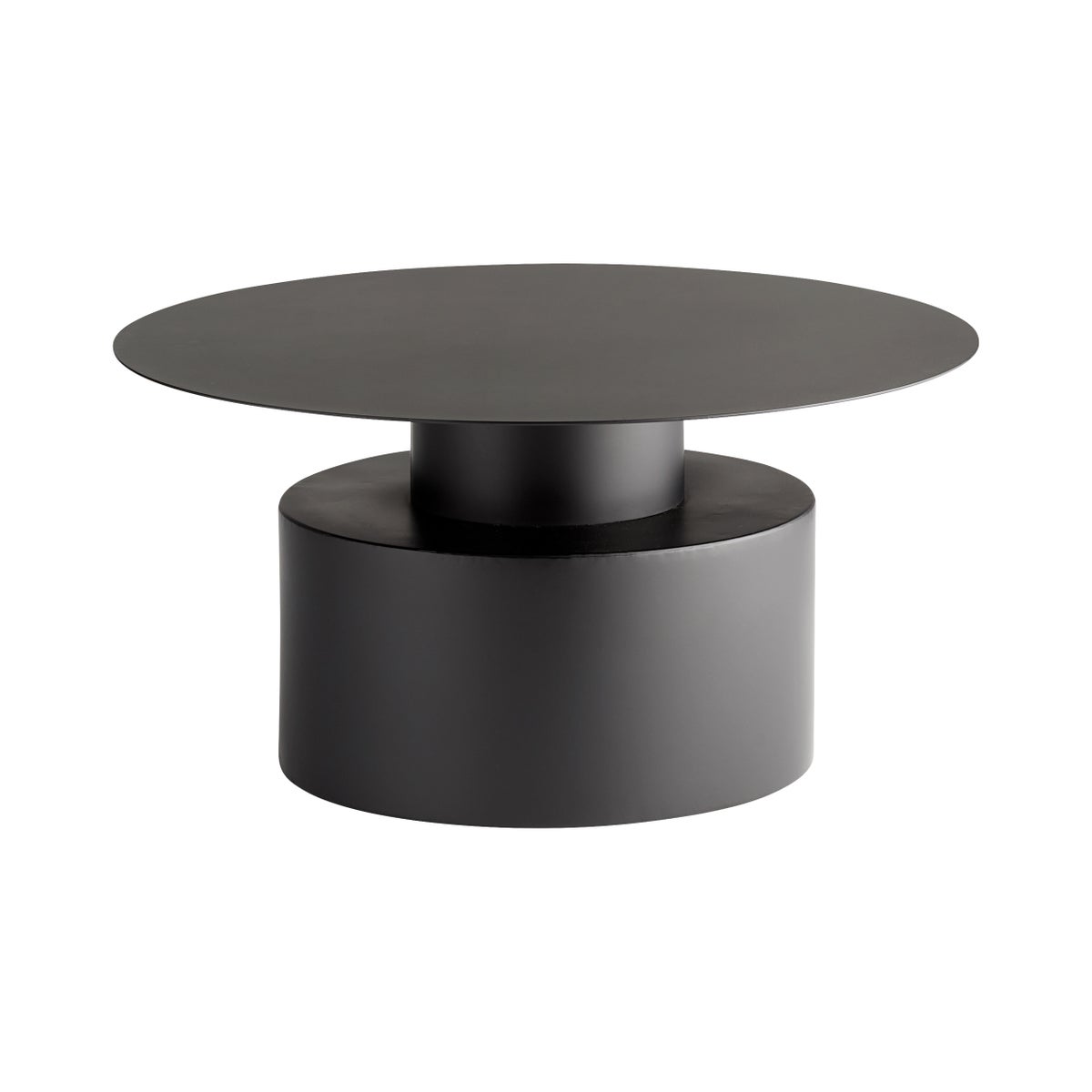 This sleek geometric table is dark and monochrome and consists of a large cylindrical base with a smaller cylindrical shaft and a large cylindrical table top. This furnishing is the perfect centerpiece for residential living spaces or commercial design projects. This stylish home furnishing has a subtle look that makes it the perfect complimentary piece in any contemporary space. Use it to add a hint of modern beauty to a traditional leaning living room space, or let it fit naturally into any minimalist-modern aesthetic.