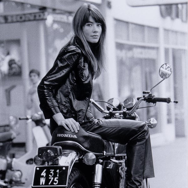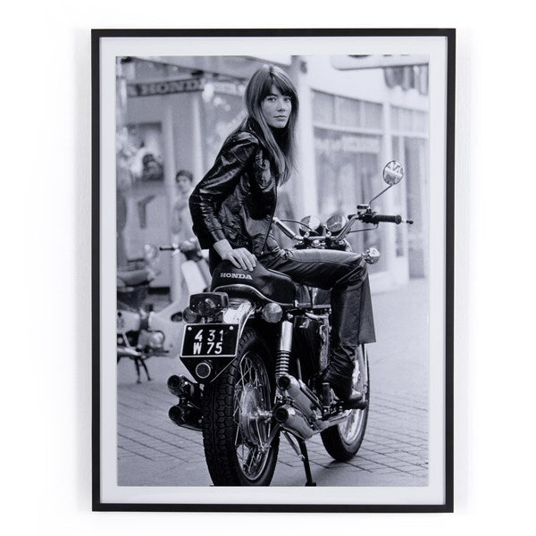 French songstress Fran�oise Hardy on a motorcycle in 1969. Photo by Reg Lancaster courtesy of Getty Images. Float-mounted and framed within black-finished American maple for a museum-quality look. Handmade in Austin, Texas, each print includes a certificate of authenticity commemorating the exclusive partnership between Getty Images and Four Hands Art Studio.