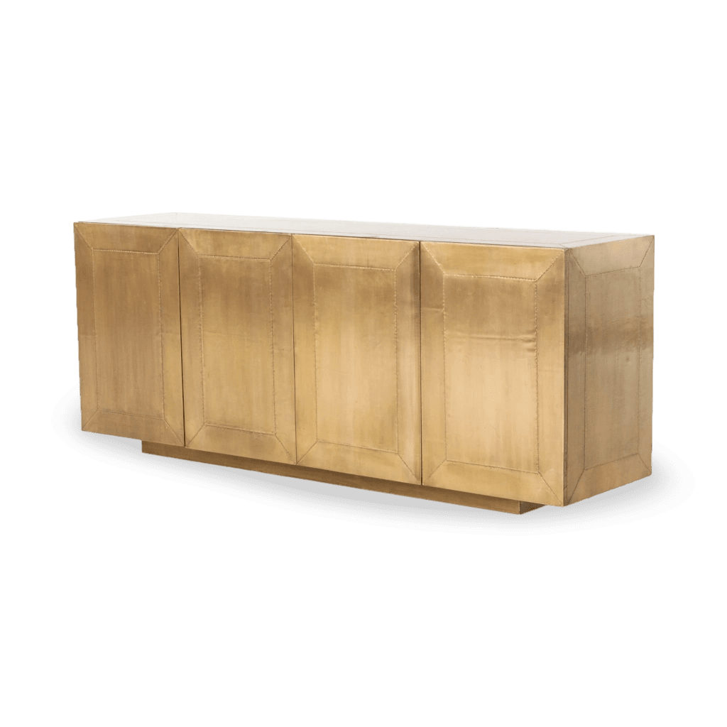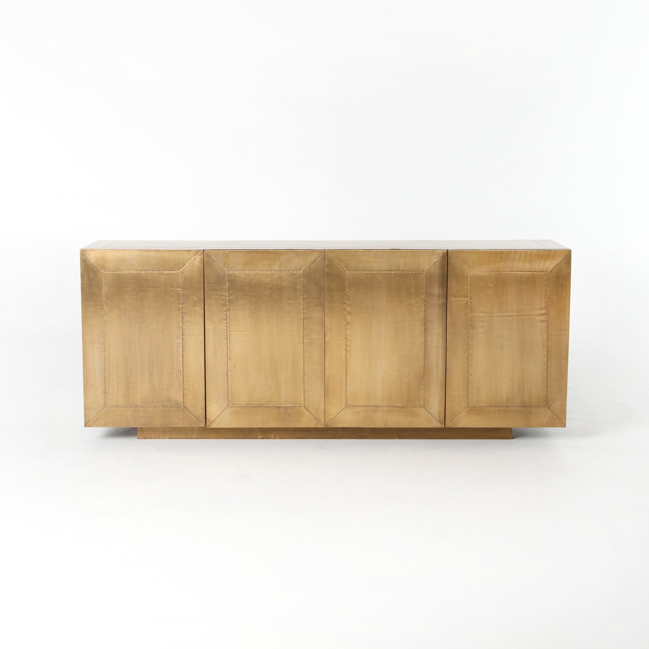 The subtle glamour of aged brass covers this clean-lined sideboard. Mitered doors and industrial spit-tack detailing. Inside features natural grey finished mango wood shelves for storage.